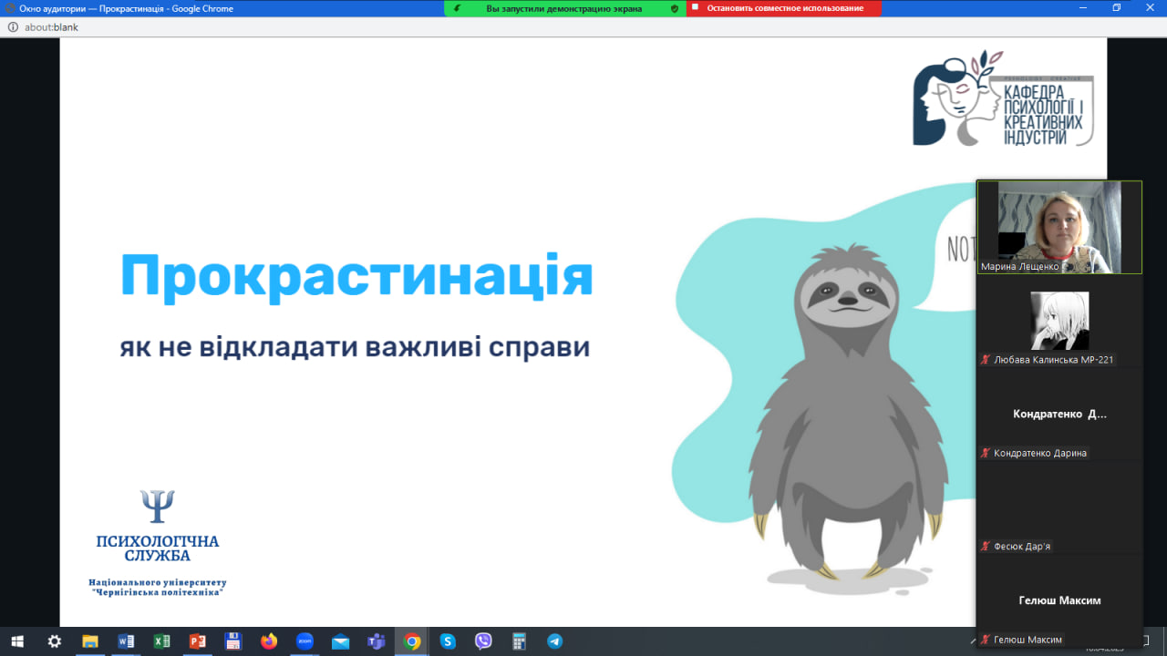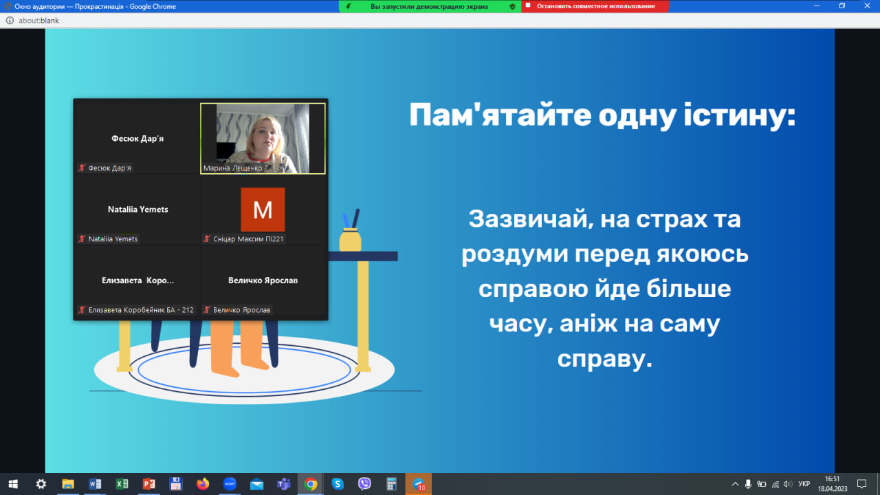Лещенко М.Є. провела онлайн зустріч «Прокрастинація: як не відкладати важливі справи», учасники якої змогли дізнатись про причини звички відкладати справи, коли ця звичка стає проблемою, способи та вправи боротьби з прокрастинацією.
