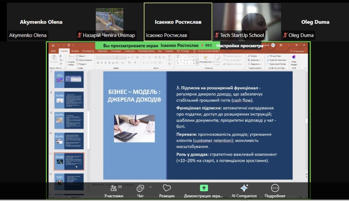 Команда «Податковий драйв», яку представляють здобувачі другого курсу спеціальності «Облік і оподаткування» ННІ бізнесу, економіки та адміністрування НУ «Чернігівська політехніка» — Ісаєнко Ростислав (капітан), Полегешко Олександра (голова студради ННІ БЕА), Рудник Ангеліна та Соболевський Андрій, — долучилася до акселераційної програми «Стартап Прорив 5.0», організованій Tech StartUp School, НУ «Львівська політехніка».