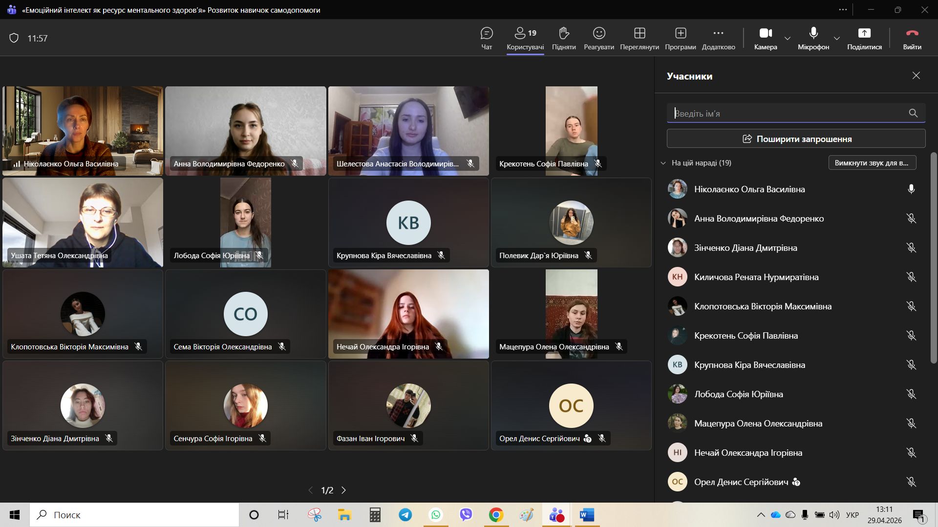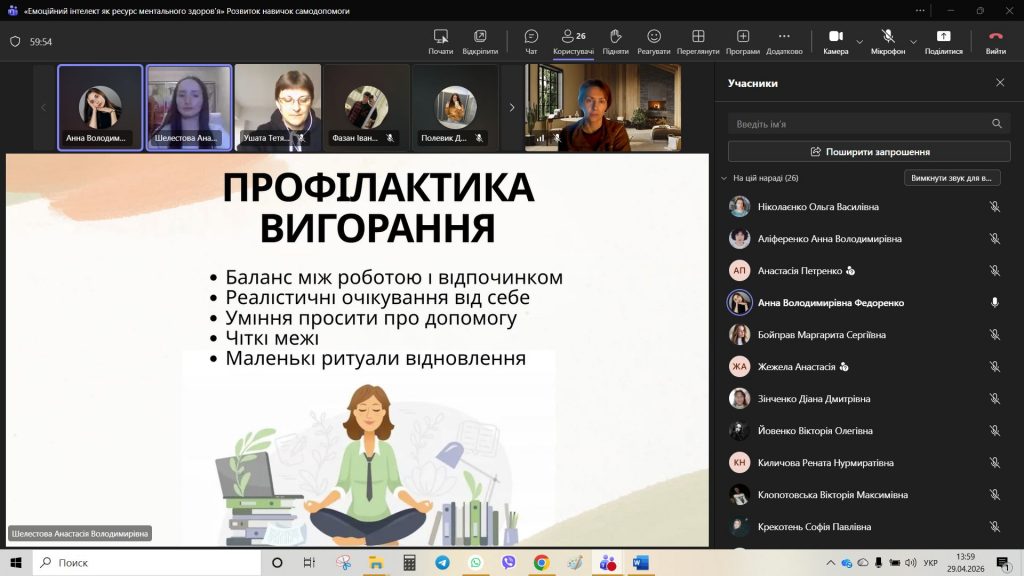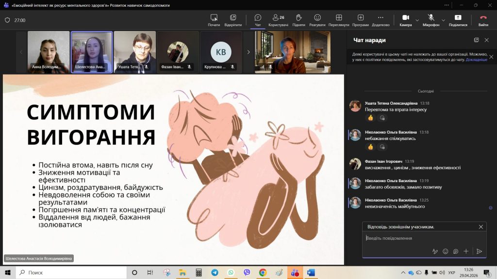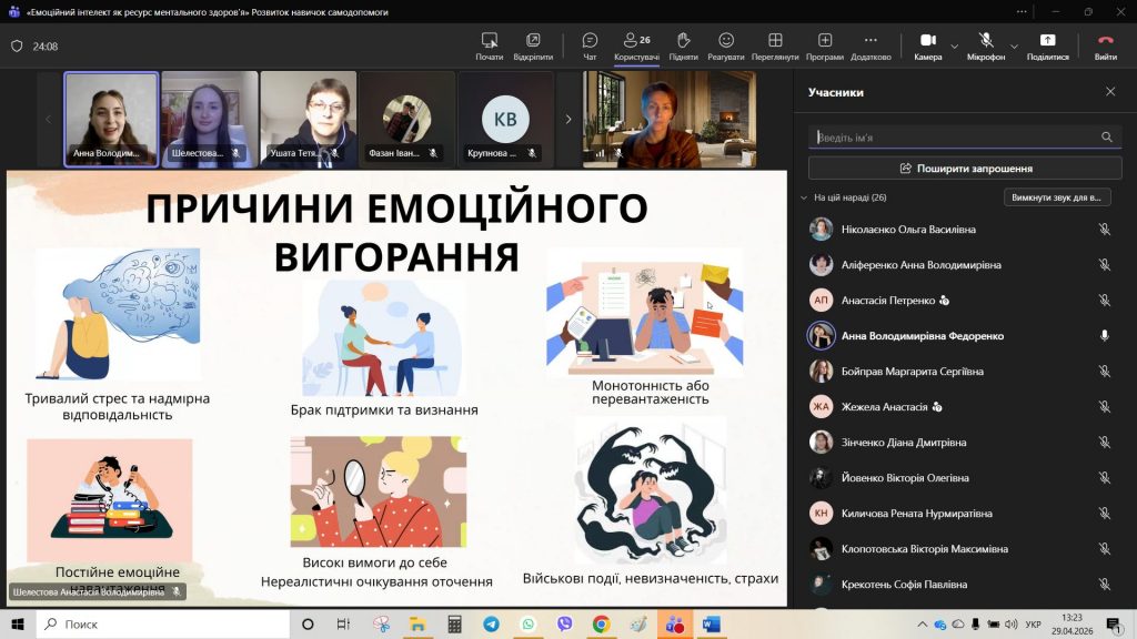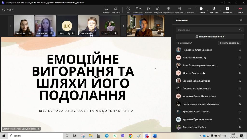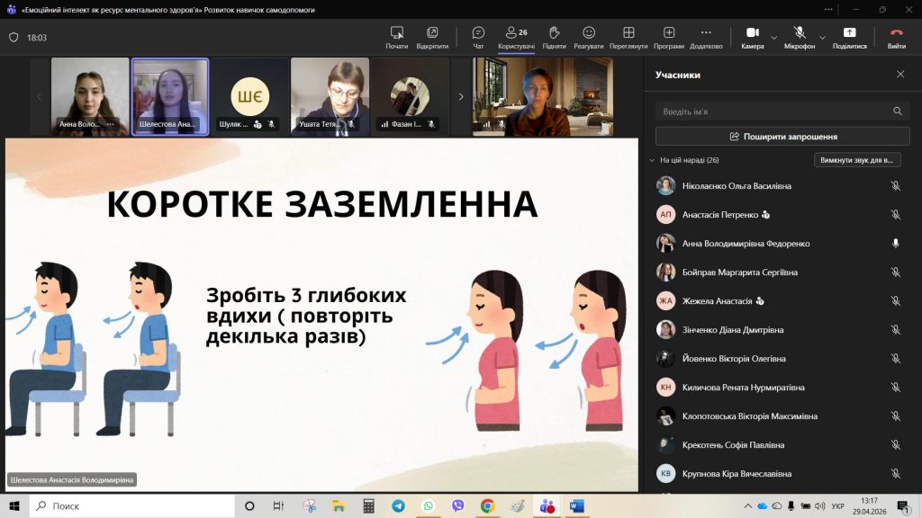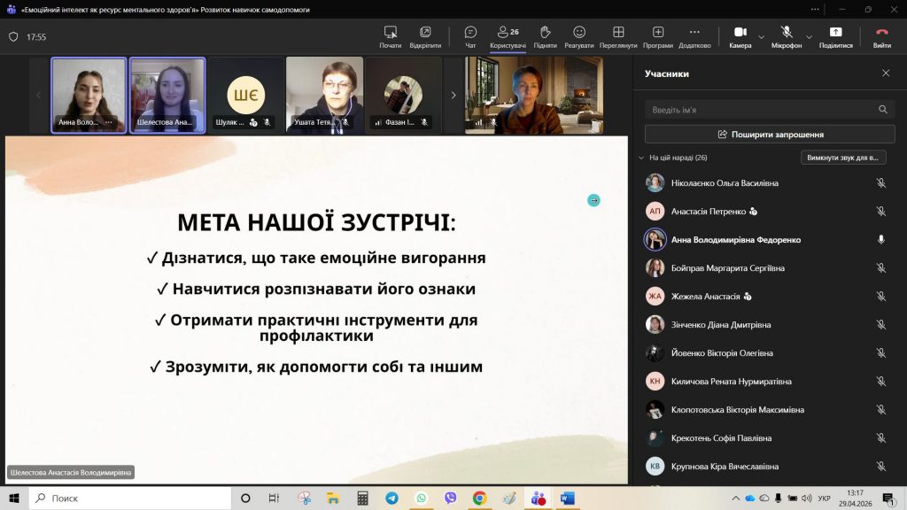 29 квітня 2026 року для студентів академічних груп ІФ-251 та ІФ-252 було проведено кураторську годину на тему: «Емоційний інтелект як ознака ментального здоров’я». До проведення зустрічі були запрошені студентки 3 курсу спеціальності «Психологія» — Шелестова Анастасія та Федоренко Анна. Майбутні психологині підготували змістовну презентацію та практичні вправи, що дозволило учасникам поглянути на емоційний інтелект як на дієвий інструмент підтримки ментального здоров’я.