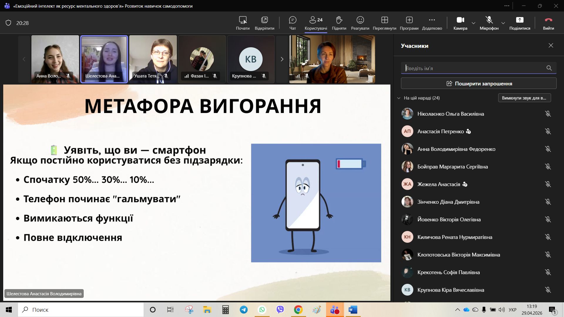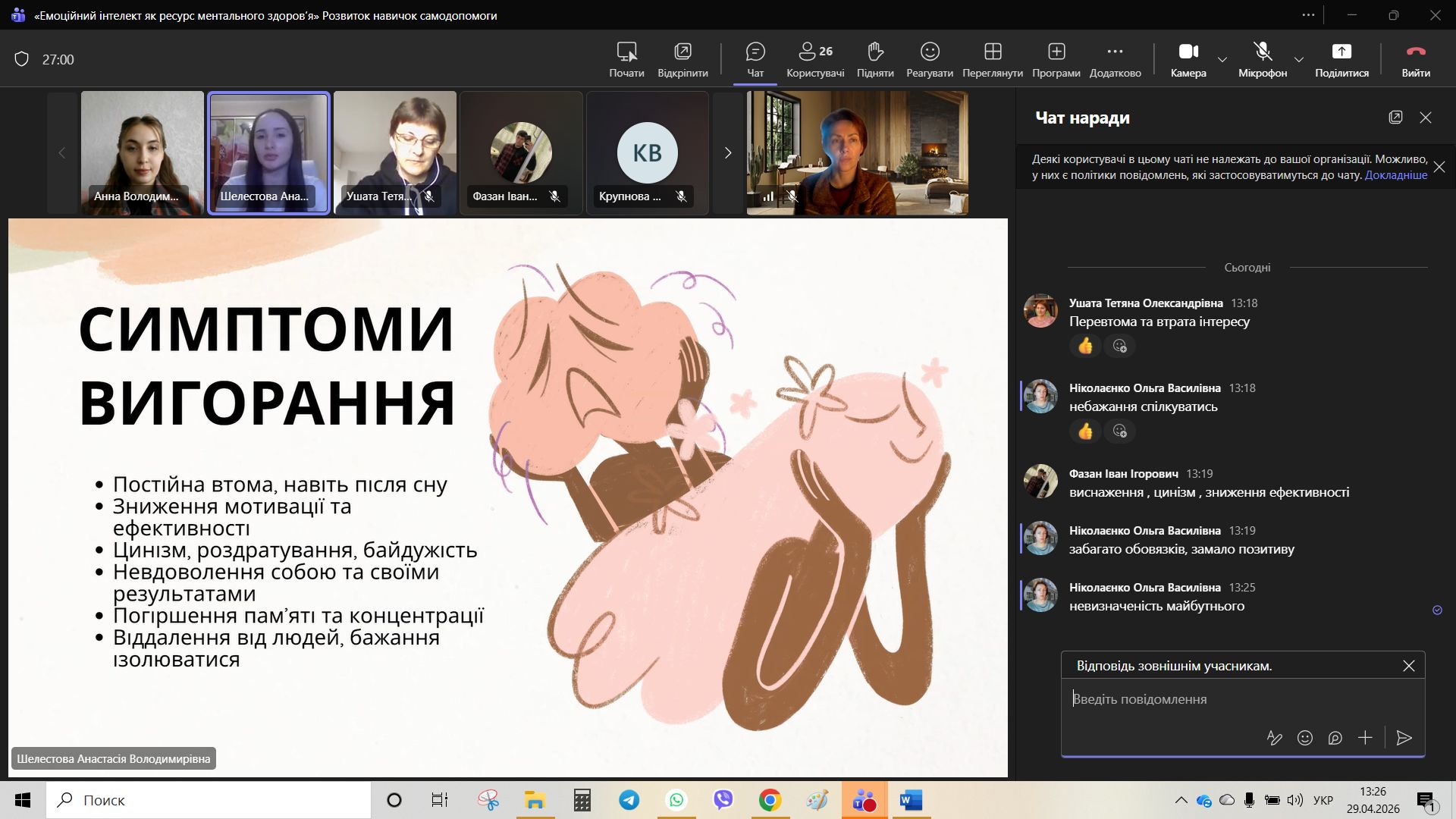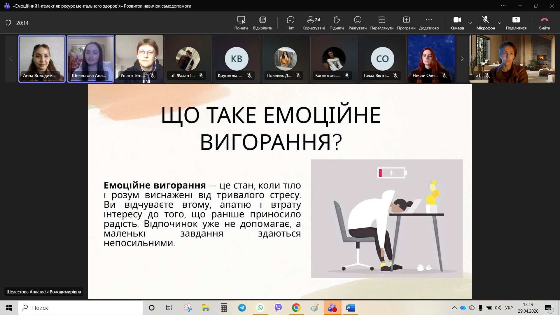 Основний блок зустрічі було присвячено темі емоційного вигорання — стану хронічного виснаження, який часто стає наслідком ігнорування власних емоційних потреб. Студенти дізналися, що вигорання не стається раптово; це процес, який має свої стадії: від надмірної залученості до повної апатії та відчуття професійної/навчальної непридатності.