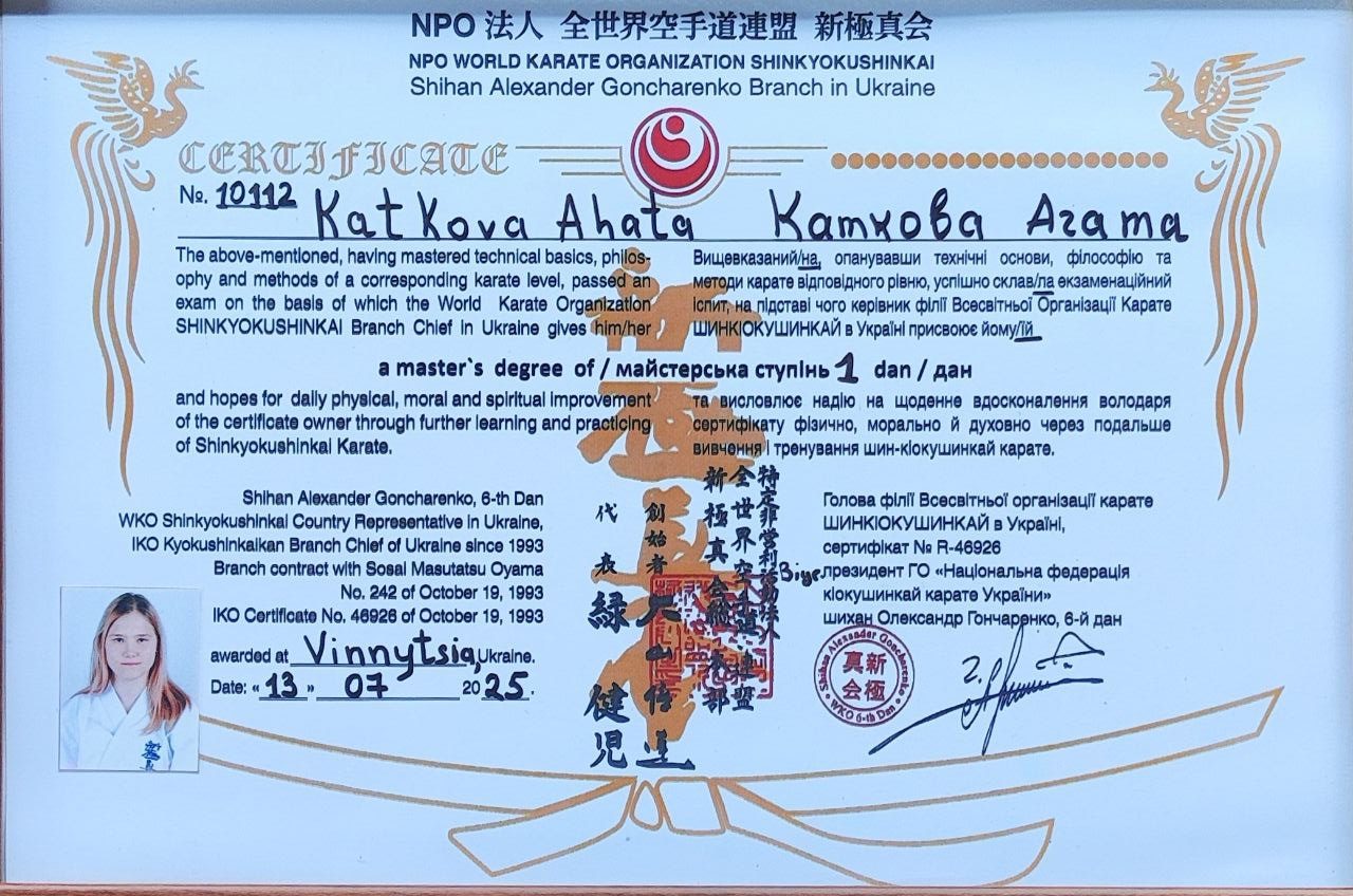 Наразі Агата чекає на свій офіційний пояс, який прибуде з Японії – країни, де зародилося карате. Саме там відбувається міжнародна реєстрація чорних поясів і видача сертифікатів, що підтверджують рівень спортсмена в усьому світі. Це робить її здобуток ще більш почесним і вагомим.