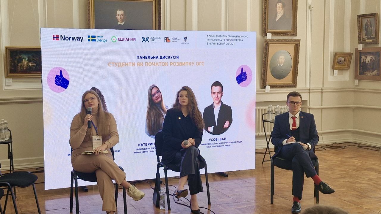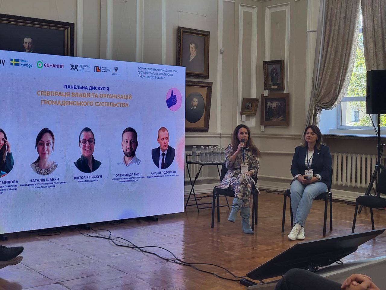 Зокрема, завідувачка кафедри філософії і суспільних наук НУ «Чернігівська політехніка» Наталія Шакун, яка виступила спікеркою на дискусійній панелі, присвяченій співпраці органів влади та громадянського суспільства. Вона підкреслила, що ефективна реалізація громадських ініціатив потребує системної співпраці з органами влади через експертний аналіз, навчання та адвокацію. Важливими є надання громадськими організаціями рекомендацій для розробки програм місцевого розвитку, участь у обговоренні та формуванні молодіжних і соціальних програм області. Акцентовано також внесок громадських організацій в інституалізацію діалогу між владою, громадськістю та міжнародними партнерами.