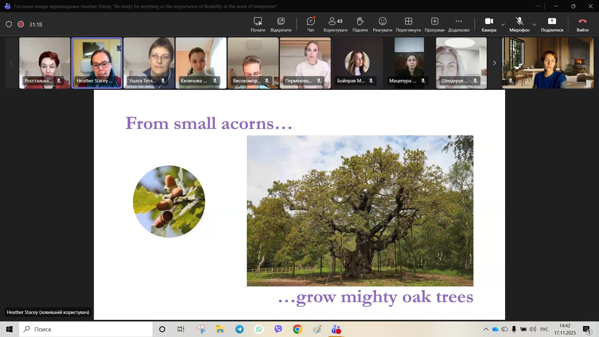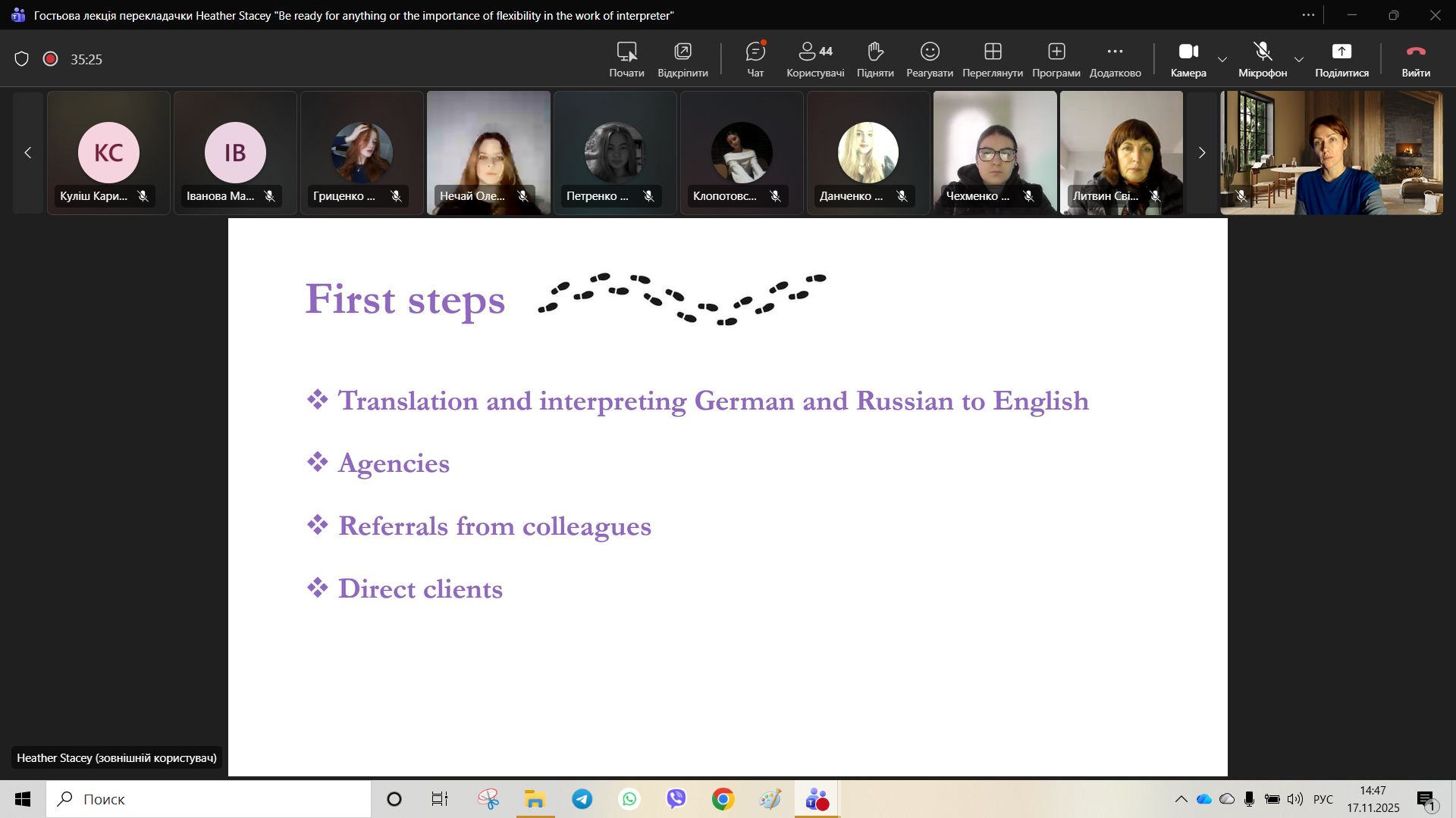 У ході лекції Хезер поділилася професійним досвідом від початку своєї кар’єри до сьогодні, окресливши етапи професійного зростання та виклики, з якими стикається перекладач у глобалізованому світі. Вона наголосила на важливості навчання впродовж усього життя, підвищення кваліфікації та постійного вдосконалення навичок у суміжних сферах — редагуванні, комунікації, медіації, роботі з цифровими інструментами.