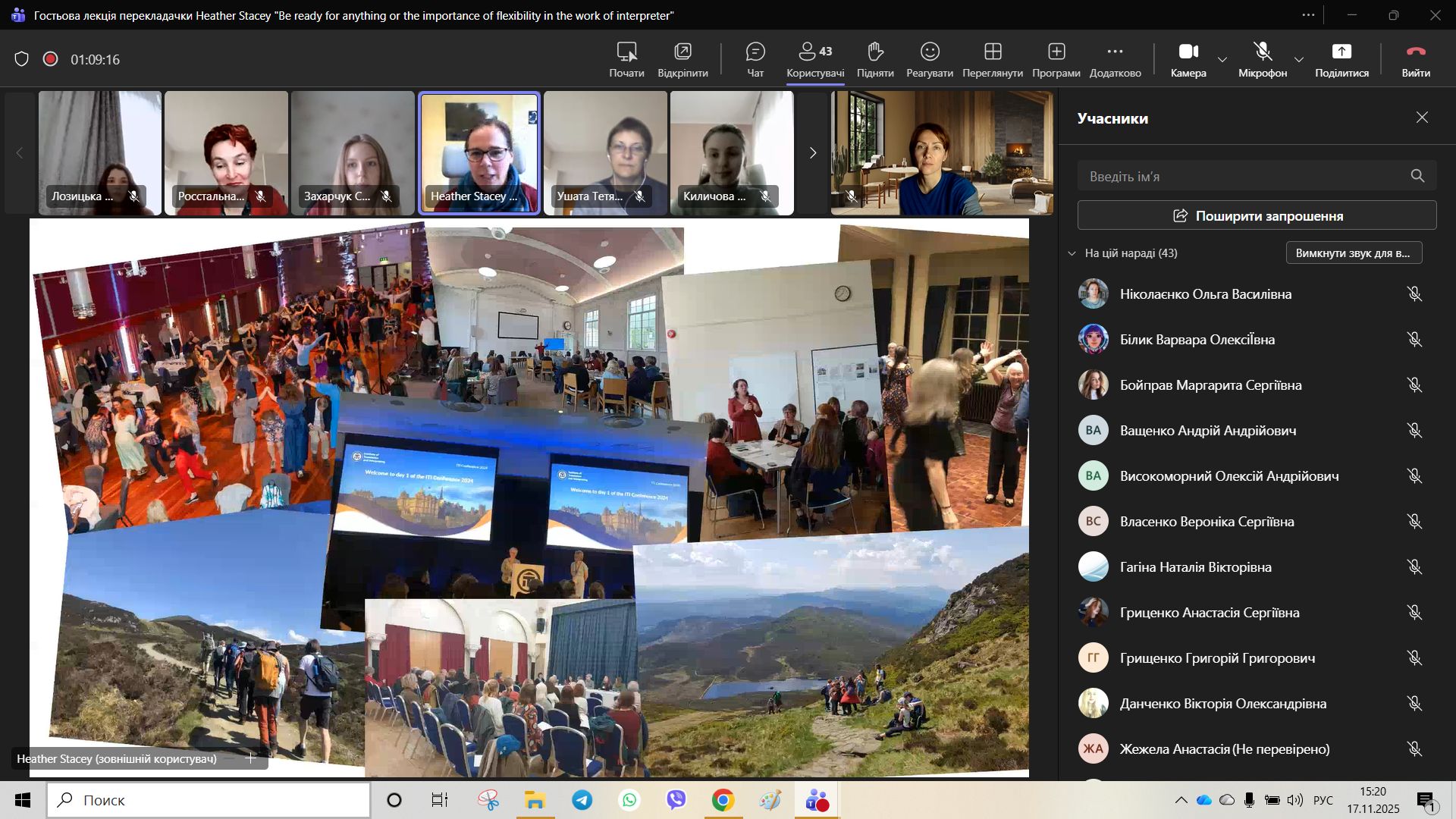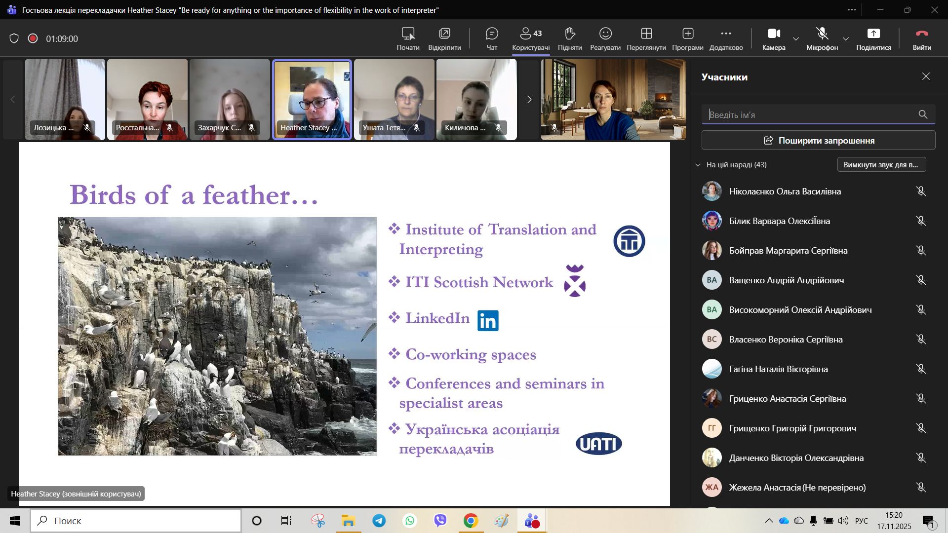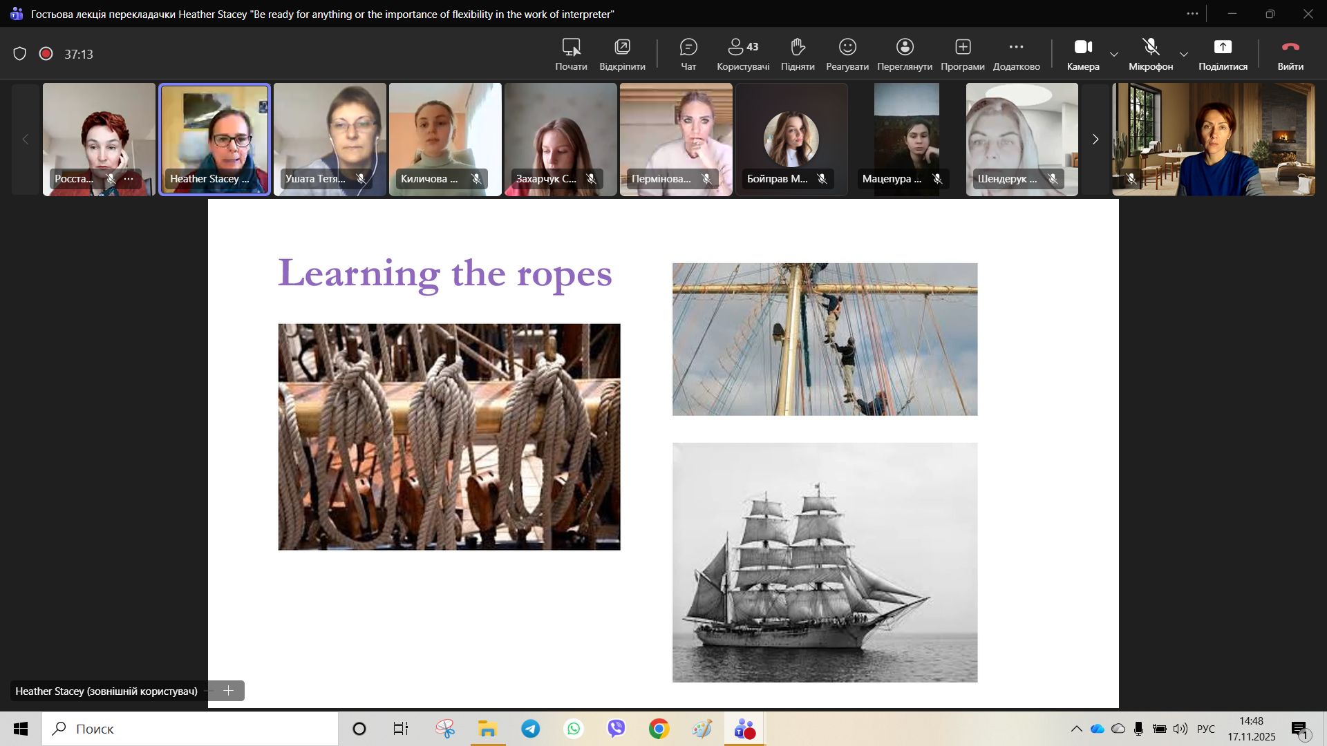 17 листопада відбулася гостьова лекція для здобувачів вищої освіти спеціальності B11 (035) Філологія від перекладачки з м. Единбург (Велика Британія) Heather Stacey на тему “Be Ready for Anything”. Спікерка є досвідченою фахівчинею у галузі усного та письмового перекладу, членкинею Асоціації перекладачів Великої Британії.