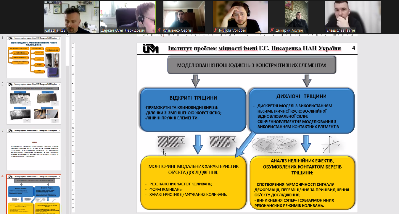04 травня на кафедрі технологій зварювання та будівництва відбулася гостьова лекція Деркача Олега Леонідовича, к.т.н., ст. дослідника, завідувача відділу коливань і вібраційної надійності Інституту проблем міцності імені Г.С. Писаренка НАН України на тему: “Застосування методів теорії руйнування до вібраційної діагностики пошкоджень конструкцій”.