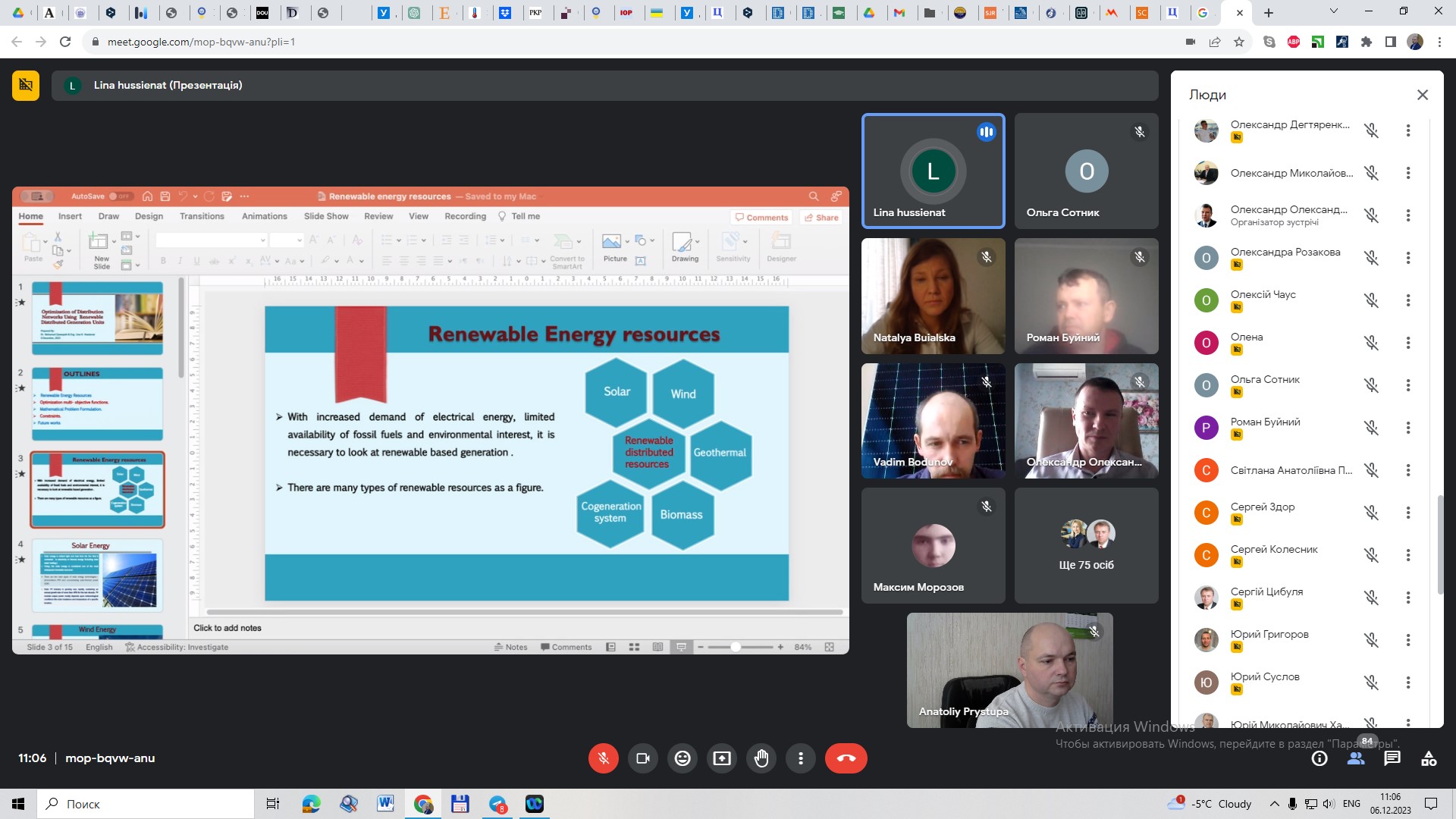 В ході лекції здобувачі ознайомились з сучасними тенденціями розвитку відновлювальних джерел енергії, технологіями моделювання режимів електроенергетичних об’єктів з відновлювальними джерелами, методами підвищення точності результатів моделювання.