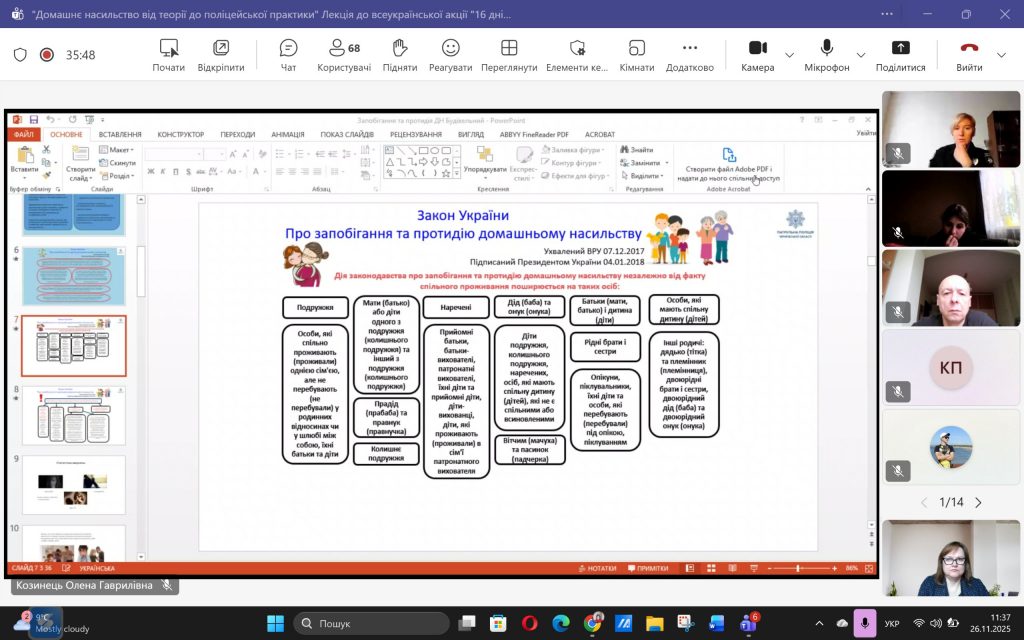 26 листопада 2025 р. на юридичному факультеті НУ «Чернігівська політехніка» відбулася гостьова лекція в межах всеукраїнської акції «16 днів проти насильства» на тему: «Домашнє насильство: від теорії до практики».