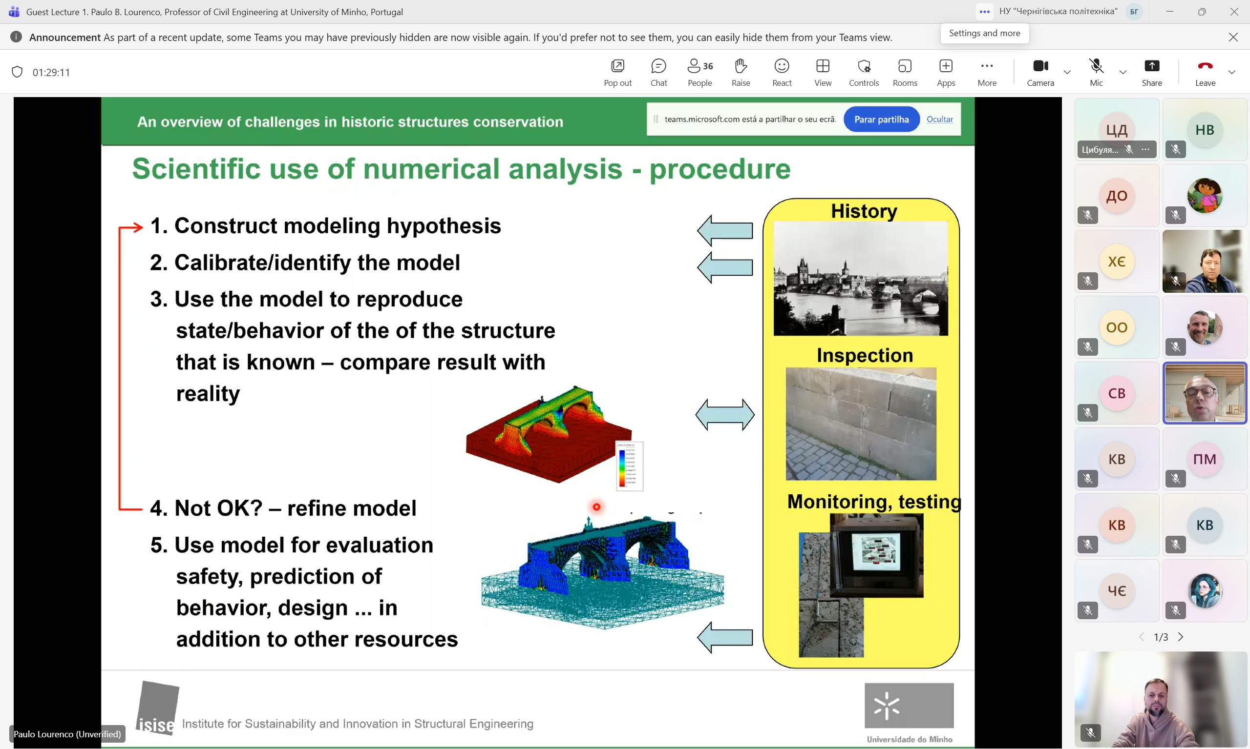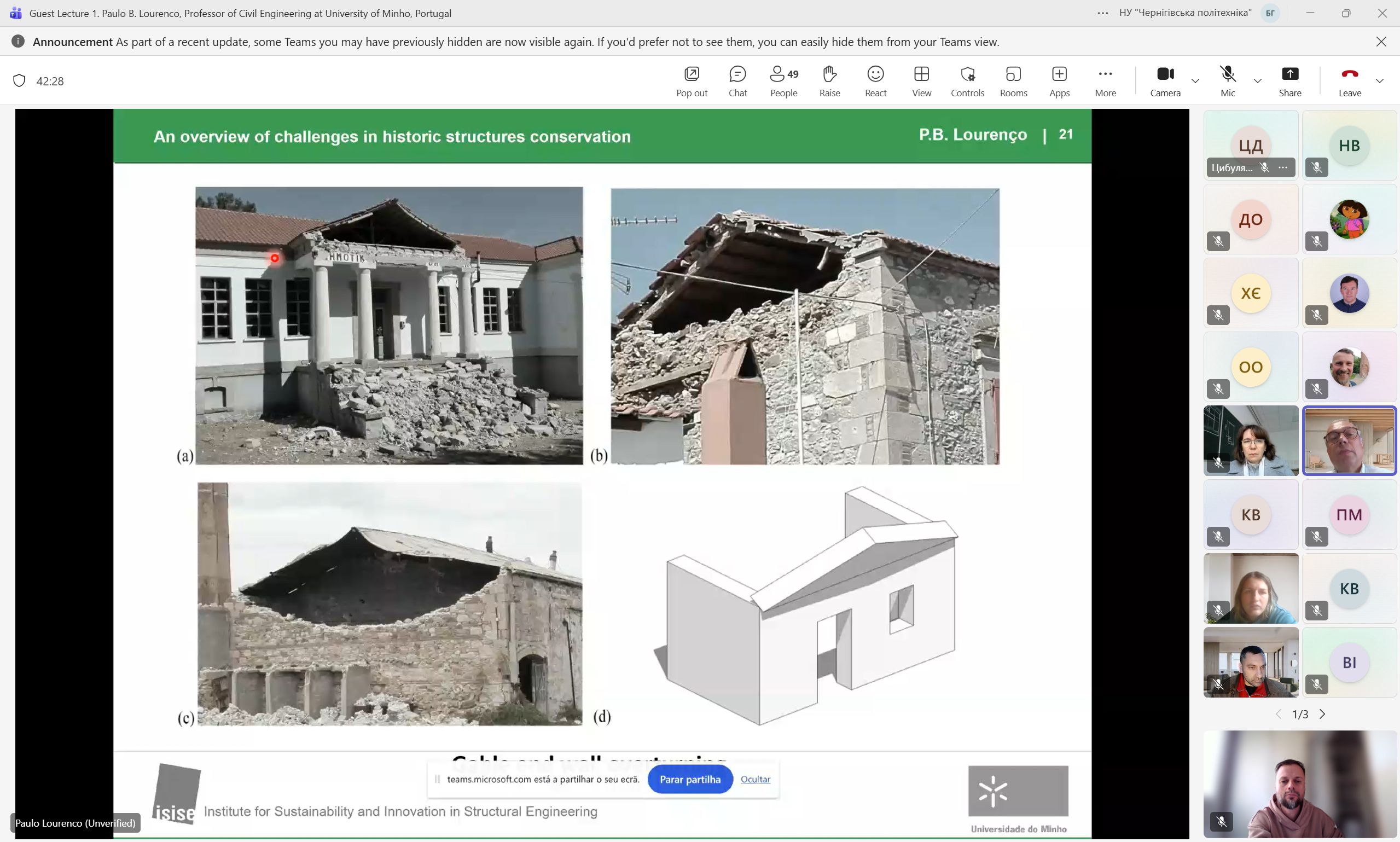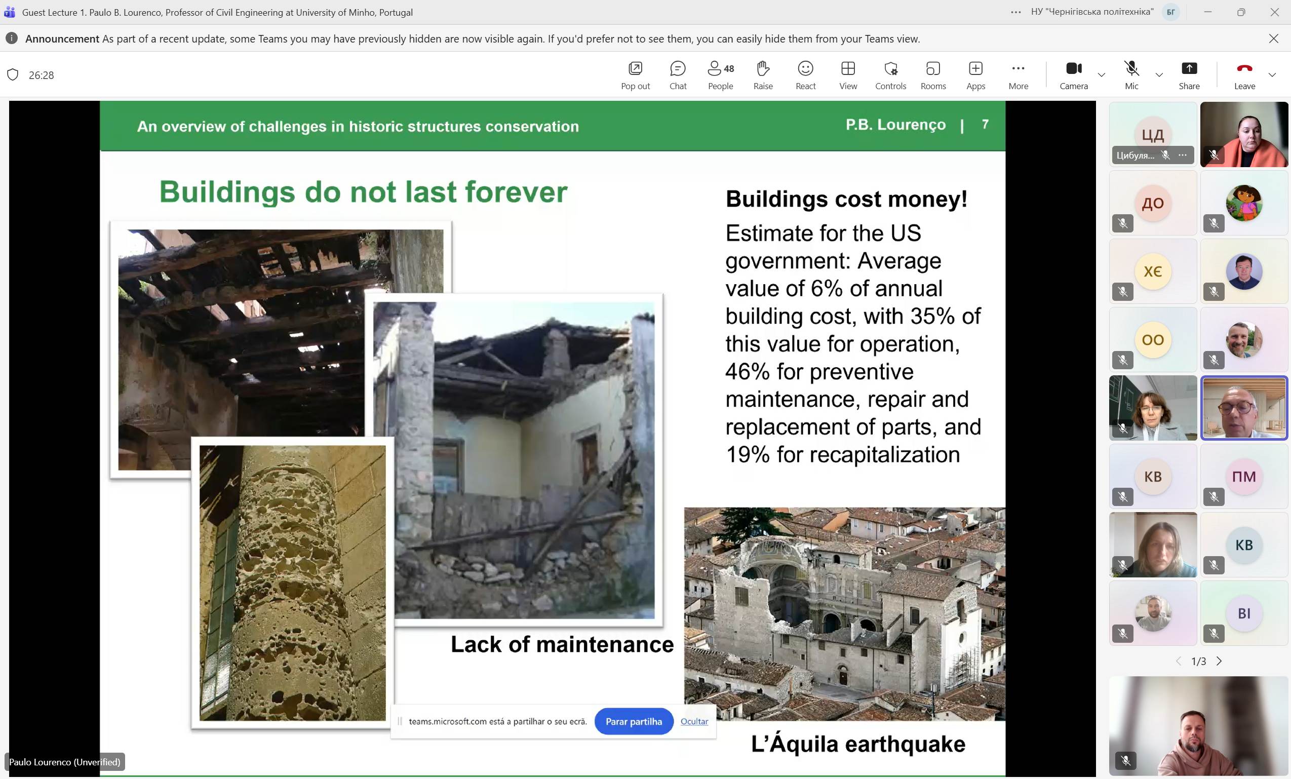 29 жовтня 2025 року на кафедрі технологій зварювання та будівництва в онлайн форматі відбулася відкрита лекція професора кафедри Цивільного будівництва Університету Мінью, Португалія, Пауло Лоренсо / Paulo B Lourenco на тему: An overview of challenges in historic structures conservation.