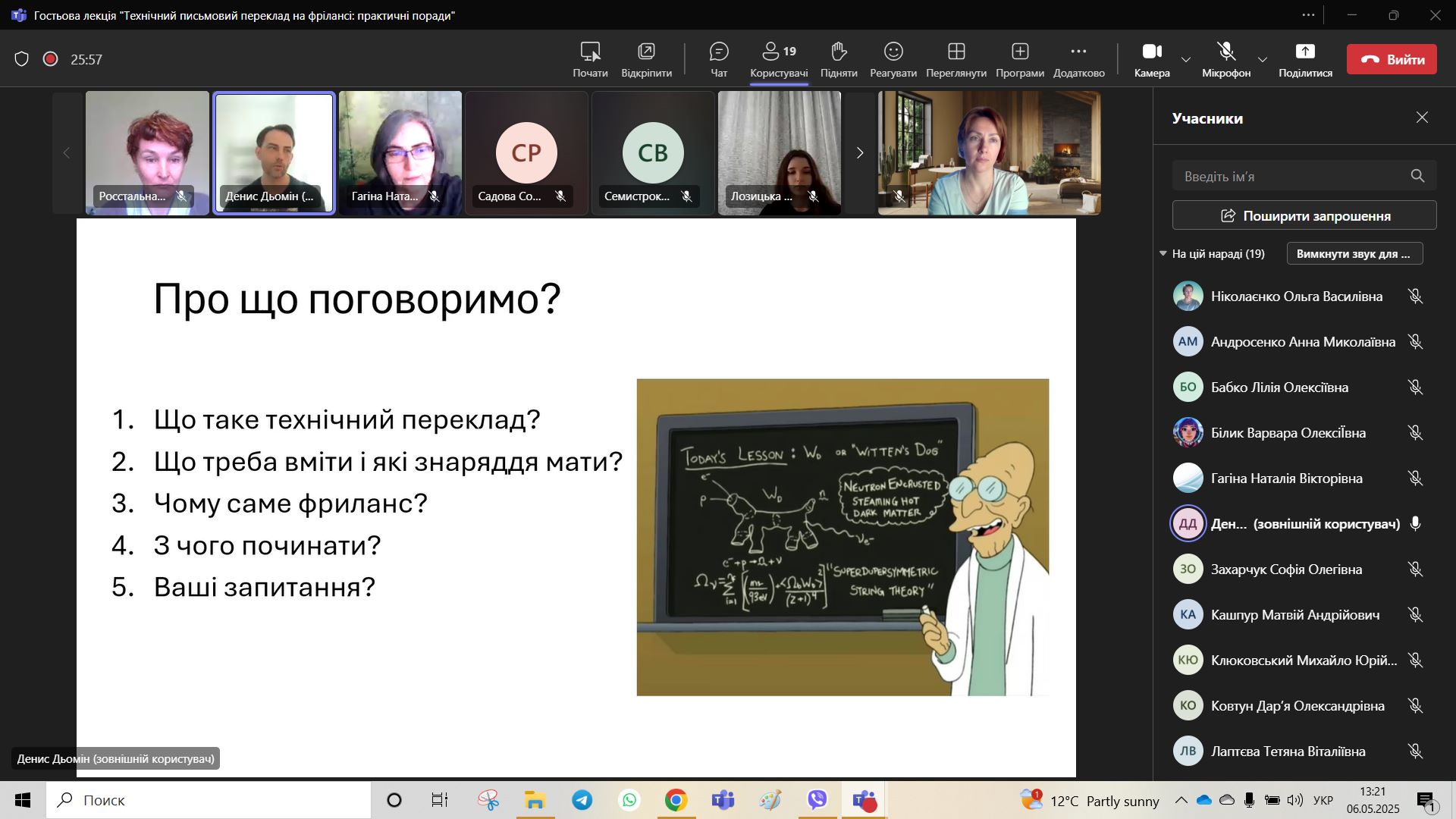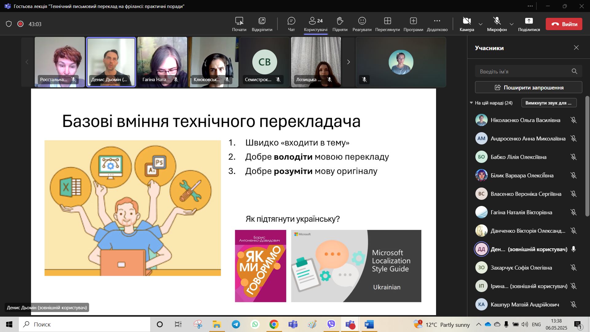 6 травня 2025 року кафедра іноземної філології організувала цікаву зустріч із досвідченим перекладачем, Денисом Дьоміним, який спеціалізується на технічному письмовому перекладі на фрилансі. Зустріч була організована з метою дати здобувачам вищої освіти спеціальності 035 Філологія корисні поради щодо цієї специфічної галузі перекладу.