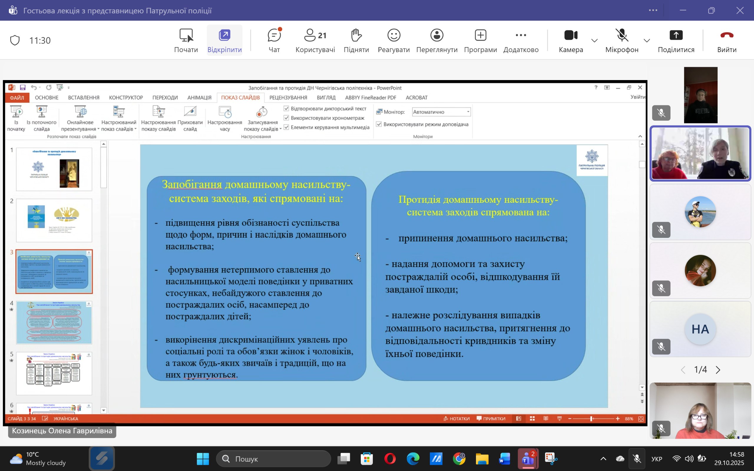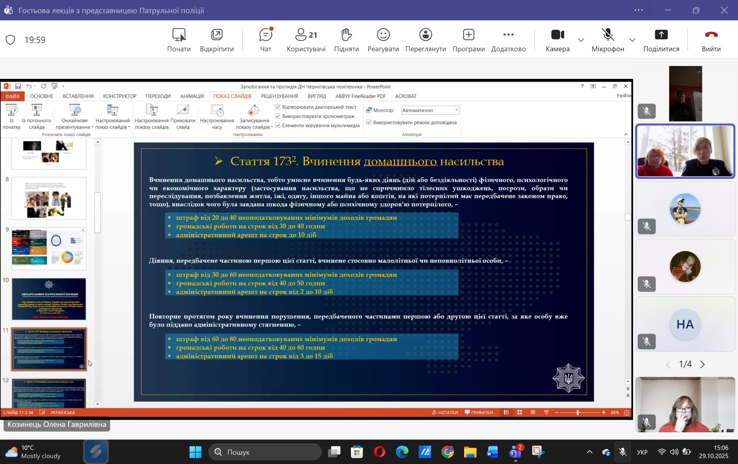 Начальниця відділу зв’язків із громадськістю управління патрульної поліції в Чернігівській області Департаменту патрульної поліції капітан поліції Ольга Мельник провела лекцію на тему «Запобігання та протидія домашньому насильству. Особливості діяльності працівників поліції з протидії домашньому насильству».