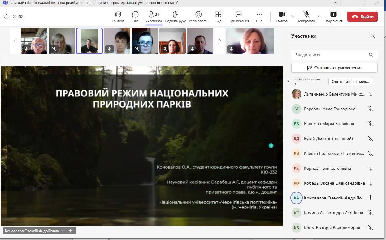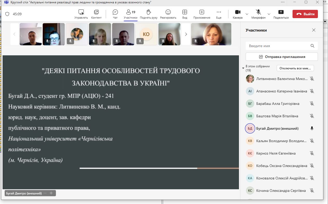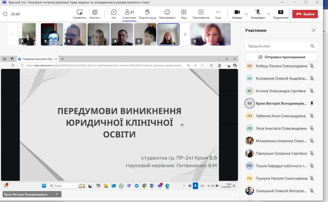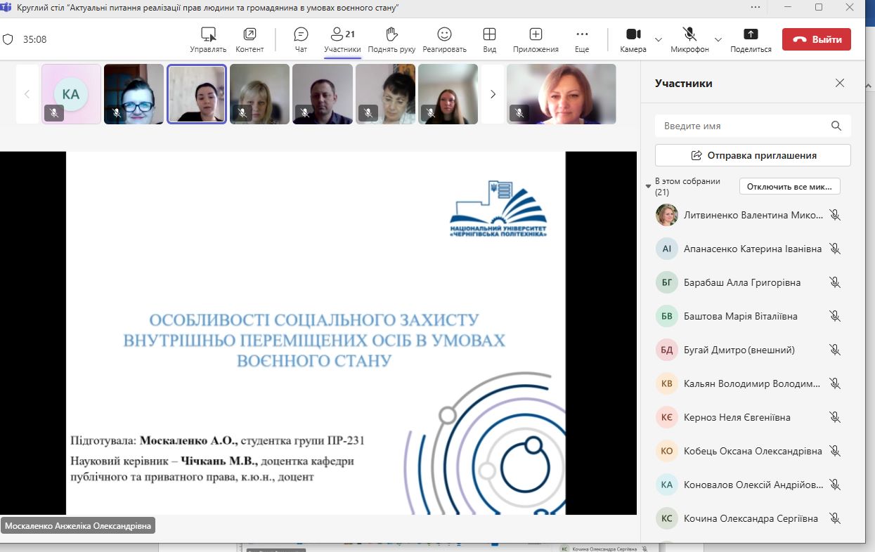 22 травня 2025 року в НУ «Чернігівська політехніка» за ініціативи кафедри публічного та приватного права відбувся Круглий стіл «Актуальні питання реалізації прав людини та громадянина в умовах воєнного стану». Захід проводився в рамках Тижня Відкритого Уряду (19 – 23 травня 2025 р.), Тижня науки та був приурочений до 65-річчя НУ “Чернігівська політехніка”. Із вступним словом до учасників звернувся декан юридичного факультету Олексій Селецький, кандидат юридичних наук, доцент та побажав результативного наукового спілкування.