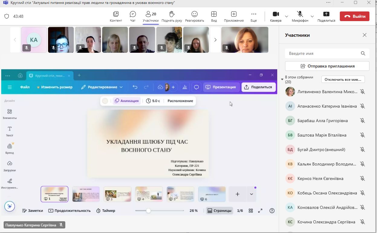 Активну участь у роботі Круглого столу взяли науково-педагогічні працівники кафедри публічного та приватного права, здобувачі вищої освіти спеціальності 081 Право освітніх програм: «Право» (бакалавр), «Кримінальна юстиція (Суд. Прокуратура. Адвокатура» (бакалавр) та «Адміністративна та цивільна юстиція» (магістр).