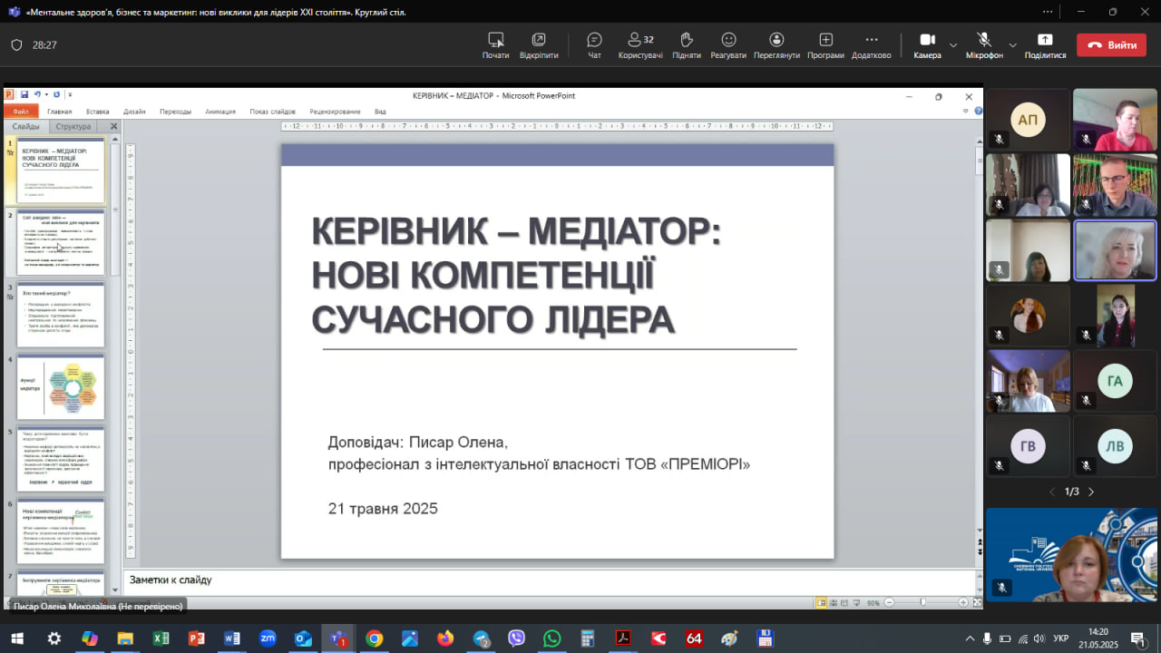 - «Керівник – медіатор: нові компетенції сучасного лідера» – Писар Олена, професіонал з інтелектуальної власності юридичного департаменту ТОВ «ПРЕМІОРІ».