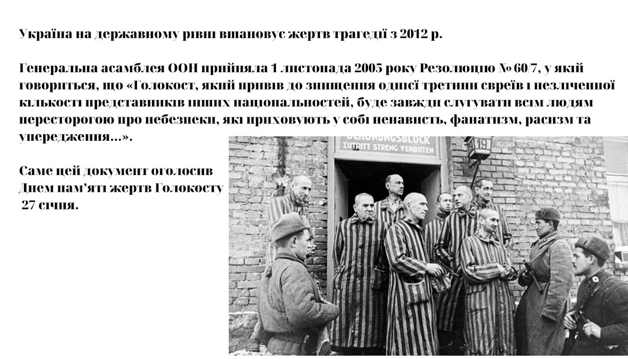 Оголосивши 27 січня Міжнародним днем пам’яті жертв Голокосту, Генеральна Асамблея ООН закликала держави-члени розробити просвітницькі програми, щоб наступні покоління зберегли пам’ять про цю трагедію з метою запобігання в майбутньому актам геноциду.