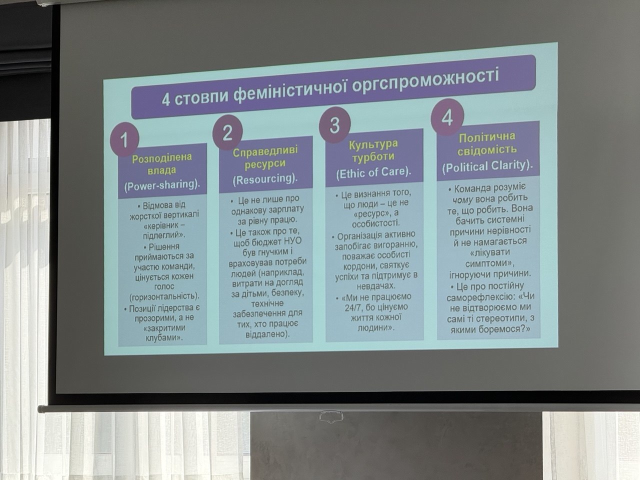 Програма тренінгу була спрямована на посилення внутрішніх процесів організацій через впровадження феміністичних підходів до лідерства, прийняття рішень та командної взаємодії. Учасниці мали змогу обговорити питання рівності, безпеки в робочому середовищі, розподілу влади та ресурсів, а також поділитися власним досвідом і викликами.