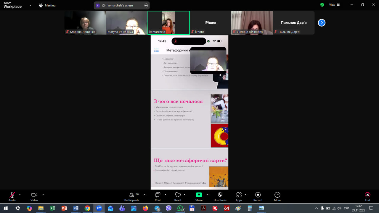 То ж, 28 листопада студенти кафедри психології мали можливість прослухати надзвичайно цікаву гостьову лекцію, присвячену метафоричним асоціативним картам (МАК) на тему “Метафоричні карти: шлях автора, психолога, підприємця”.