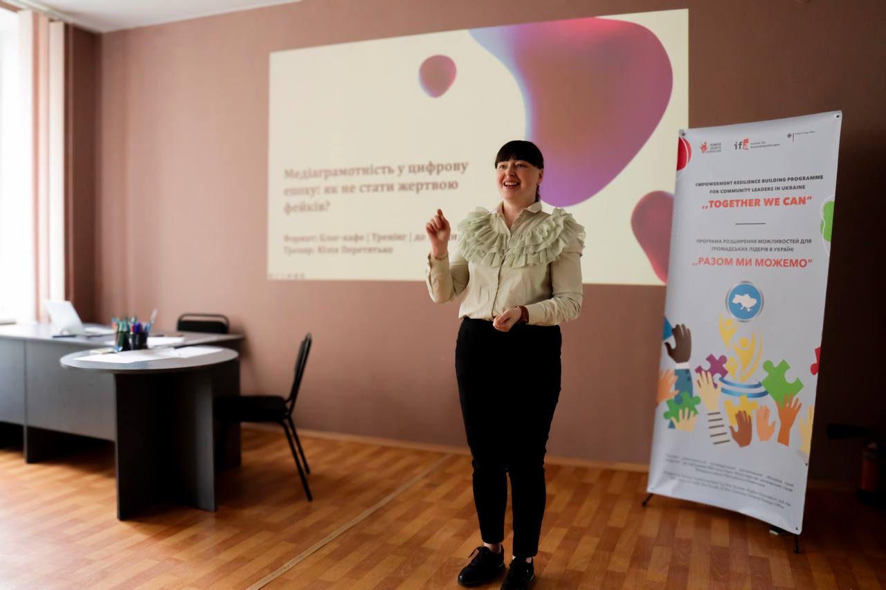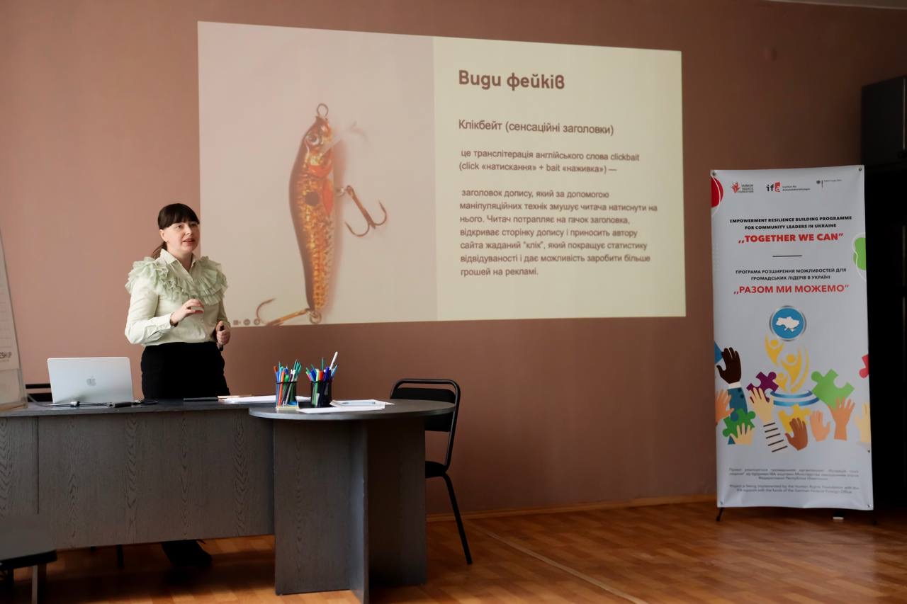 Тренер Юлія Перетятько разом із учасниками обговорювали загрози сучасного інформаційного простору, канали поширення недостовірної інформації, а також вчилися розпізнаватидезінформацію, неправду, клікбейти, маніпуляції у засобах масової інформації та соціальних мережах.