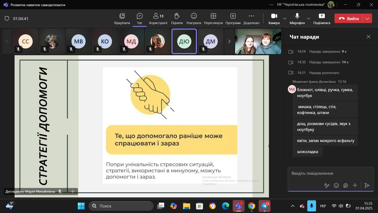 Так, протягом квітня-травня 2025 р. Центр ментального здоров’я НУ «Чернігівська політехніка» впроваджує тренінгову програму «Емоційний інтелект як ресурс ментального здоров’я», яка розроблена в межах Всеукраїнської програми «Ти як?», ініційованої Першою Леді Оленою Зеленською.