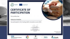 Координатор розвитку стартапів, інновацій та проєктного навчання НУ “Чернігівська політехніка”, співзасновниця вітчизняного healthtech-стартапу «Інсулін без черг», к.е.н., доцент Гнедіна Катерина успішно пройшла відбір та стала учасницею міжнародної інноваційної програми Creating ValEU від EIT Health у партнерстві з Oxford University Hospitals NHS Foundation Trust.