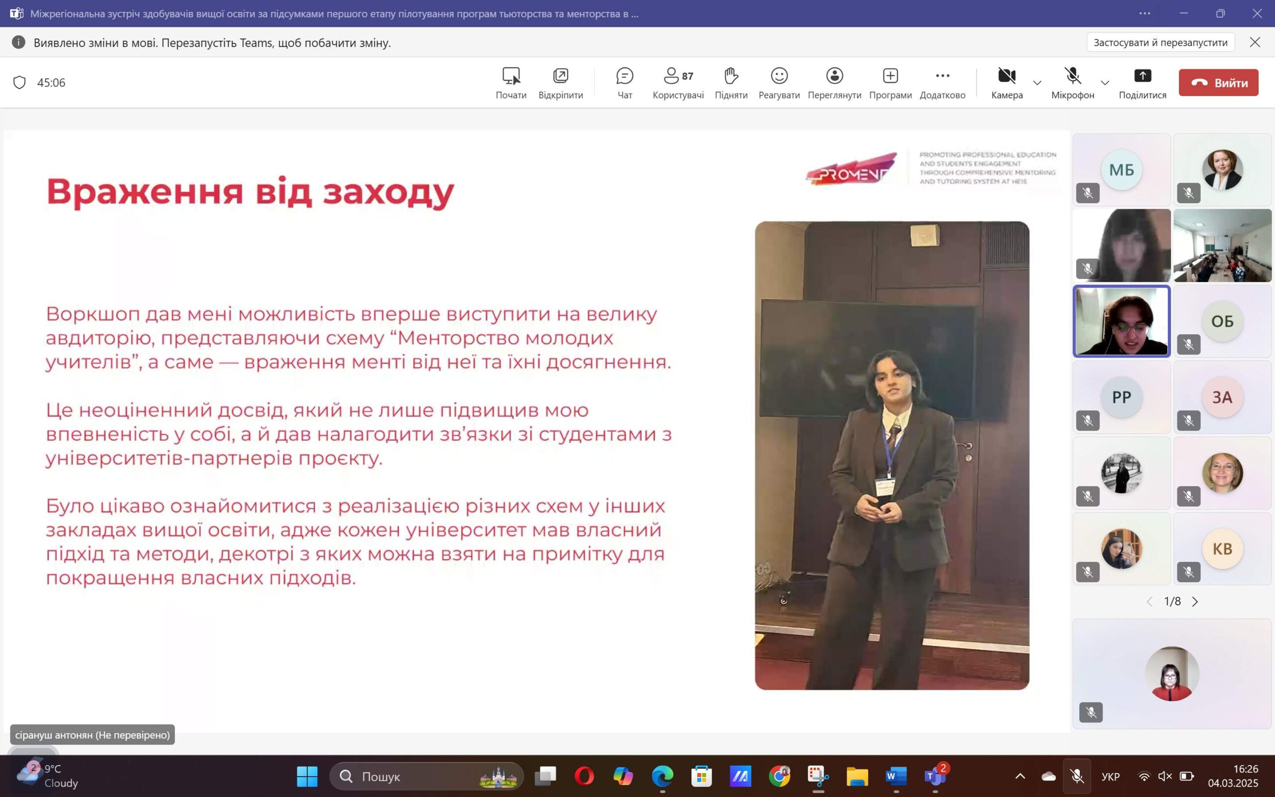 4 березня 2025 року за ініціативою Національного університету «Чернігівська політехніка» в змішаному форматі відбулася Міжрегіональна зустріч здобувачів вищої освіти університетів-партнерів проєкту ЄС Erasmus+ PROMENT за підсумками першого етапу пілотування програм тьюторства та менторства в 2024 році.