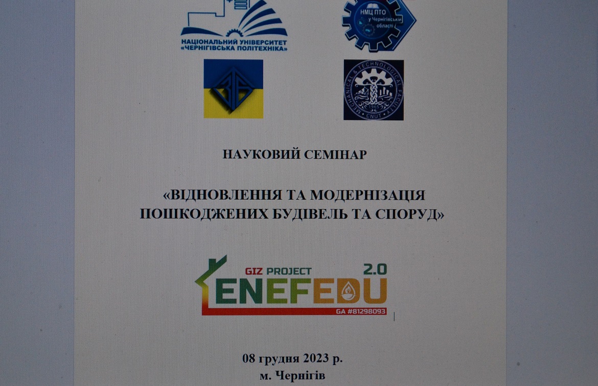 08 грудня в стінах Національного університету «Чернігівська політехніка» відбувся науковий семінар «Відновлення та модернізація пошкоджених будівель та споруд». Захід був проведений спільно з Навчально-методичним центром професійно-технічної освіти у Чернігівській області в межах грантового проєкту № 81298093 «Енергоефективний навчальний заклад. Термомодернізація закладів П(ПТ)О у рамках розроблених курсів енергоефективності. 2.0» (ENEFEDU 2.0) #GIZ_ENEFEDU2.0 у співпраці з Міністерством освіти і науки України за підтримки проєкту технічного співробітництва «Просування енергоефективності та імплементації Директиви ЄС з енергоефективності в Україні» (далі – проект FEER), який реалізує Deutsche Gesellschaft für Internationale Zusammenarbeit (GIZ) GmbH за дорученням Міністерства економічного розвитку та співробітництва Німеччини та співфінансується урядом Швейцарії.