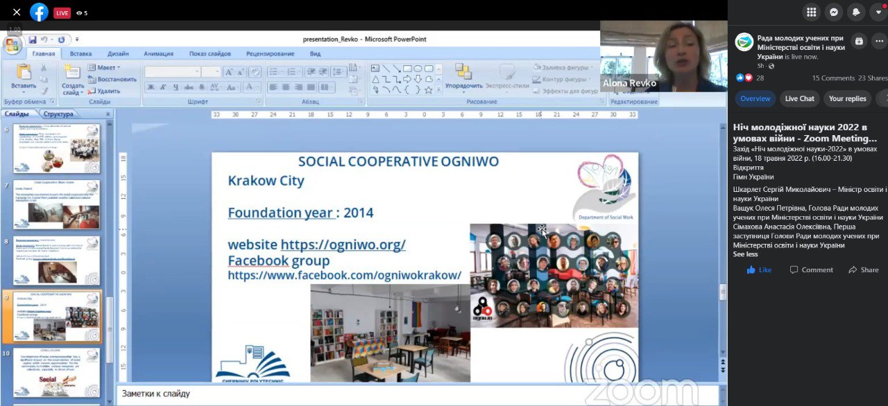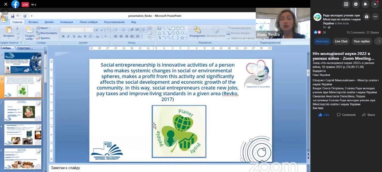 Професорка кафедри соціальної роботи, доктор економічних наук, Ревко Альона Миколаївна, 18 травня 2022 року прийняла участь у заході Ради молодих учених при Міністерстві освіти і науки України «Ніч молодіжної науки-2022 в умовах війни» та представила результати своїх досліджень на тему: “Social Entrepreneurship as a Tool for Solving Social Problems in War Conditions: Polish and Ukrainian Experience”.