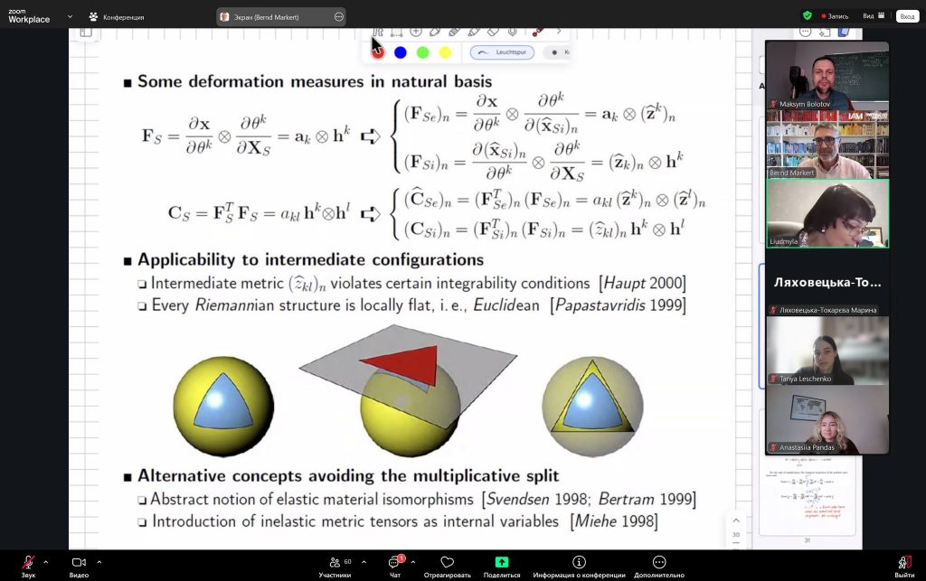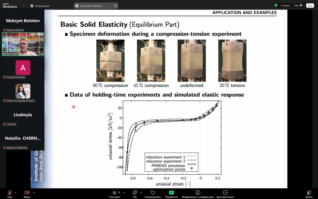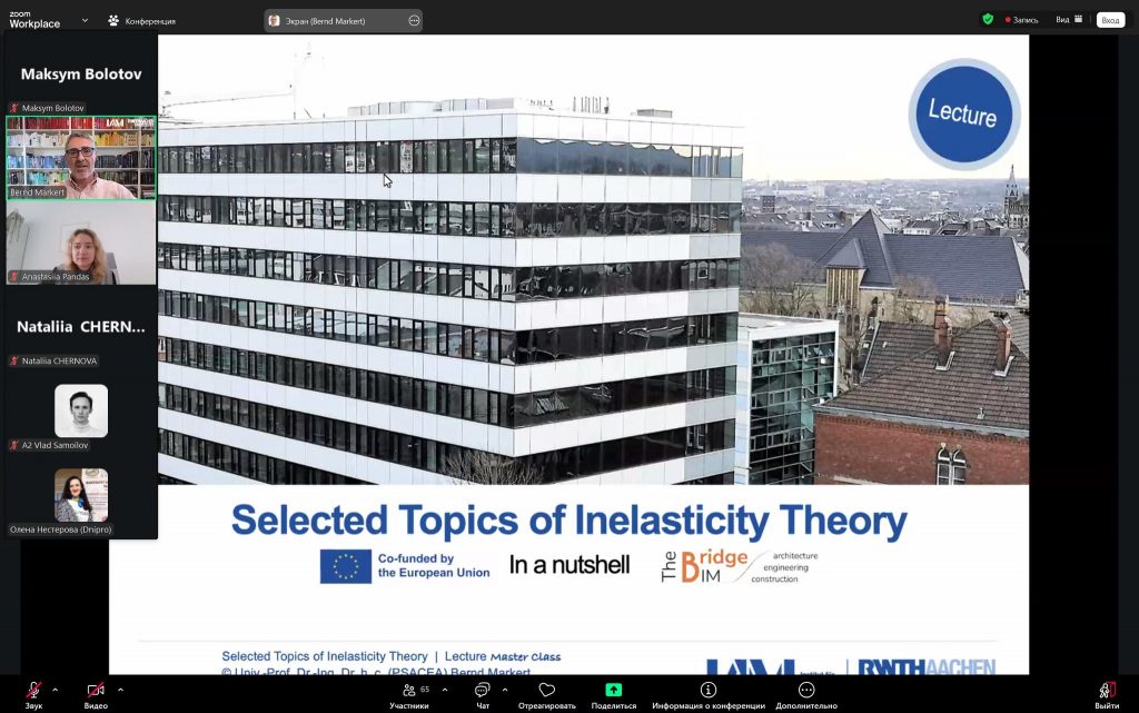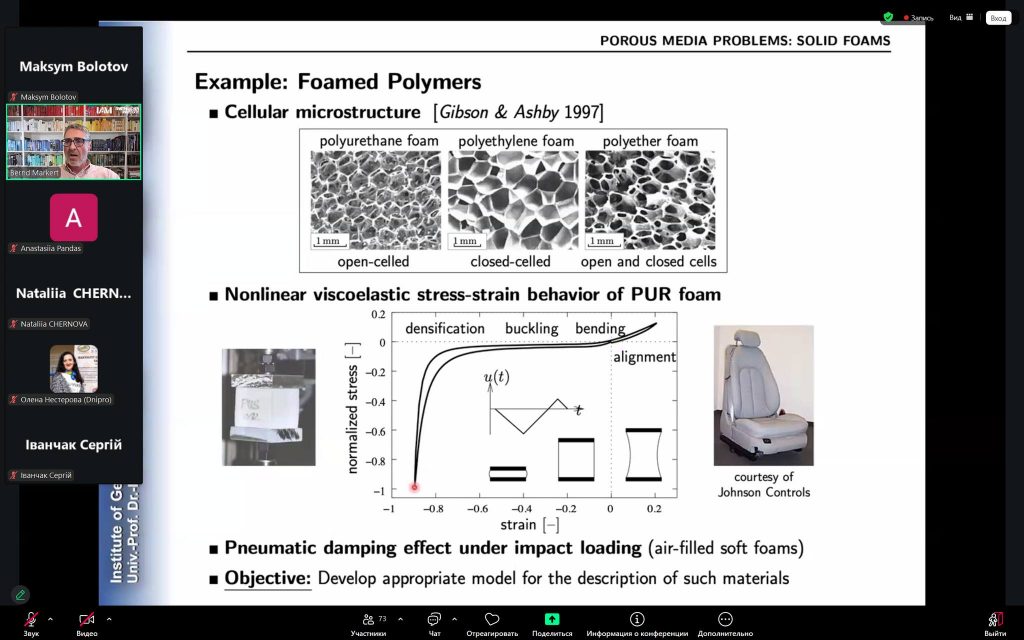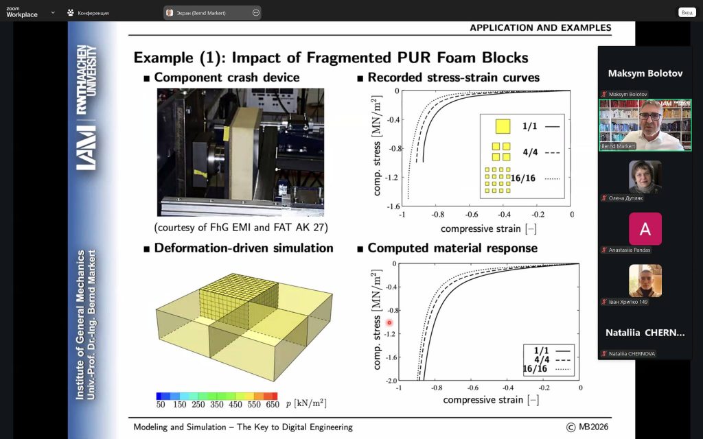 Так, лекційну частину програми було представлено директором Інституту загальної механіки, професором д.-інж. Bernd Markert. У межах своїх виступів він висвітлив ключові аспекти курсів «Механіка пористих матеріалів» та «Деякі питання теорії непружності», акцентуючи увагу на сучасних наукових підходах і їх прикладному значенні у будівельній та машинобудівній галузях.