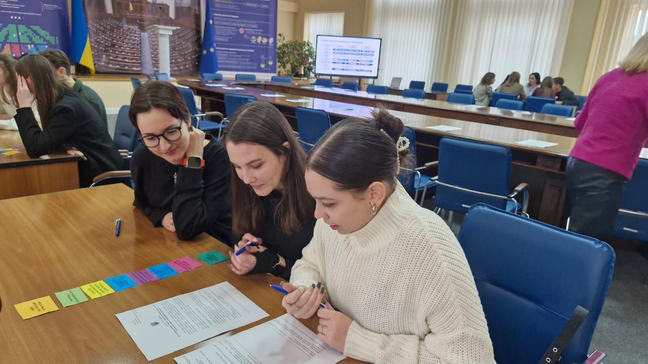 В практичній частині студенти взяли участь в грі-моделюванні засідання Комітету Верховної Ради України. Учасники поділились на 4 фракції для обговорення одного законопроекту з перспективи різних політичних позицій. Підсумком стало голосування за законопроект.