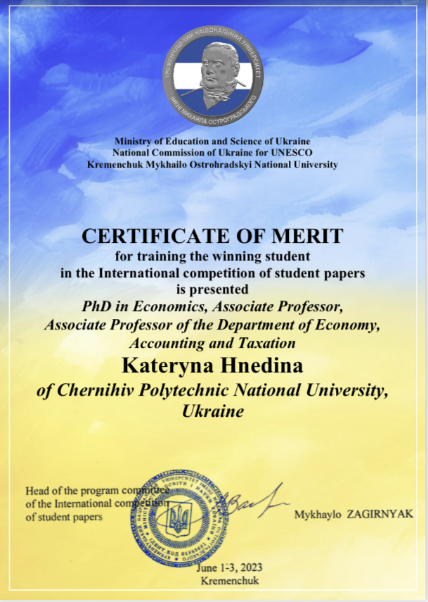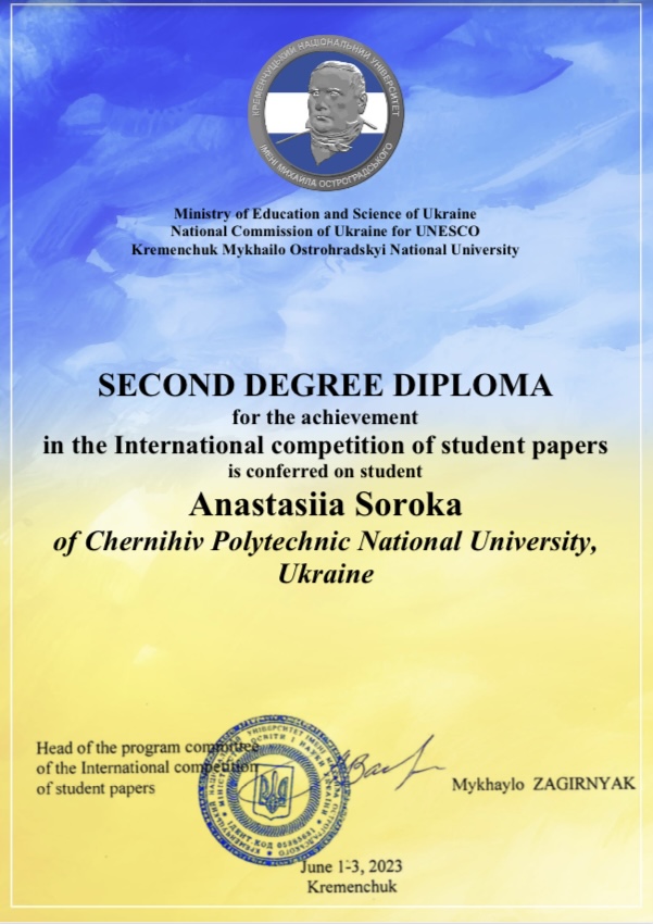 За результатами Міжнародного конкурсу студентських наукових робіт у 2022-2023 навчальному році за спеціальністю 051 «Економіка», проведеного на базі Кременчуцького національного університету імені Михайла Остроградського, здобувачка вищої освіти Національного університету «Чернігівська політехніка», спеціальності 051 «Економіка» Сорока Анастасія Володимирівна нагороджена Дипломом II ступеня.
