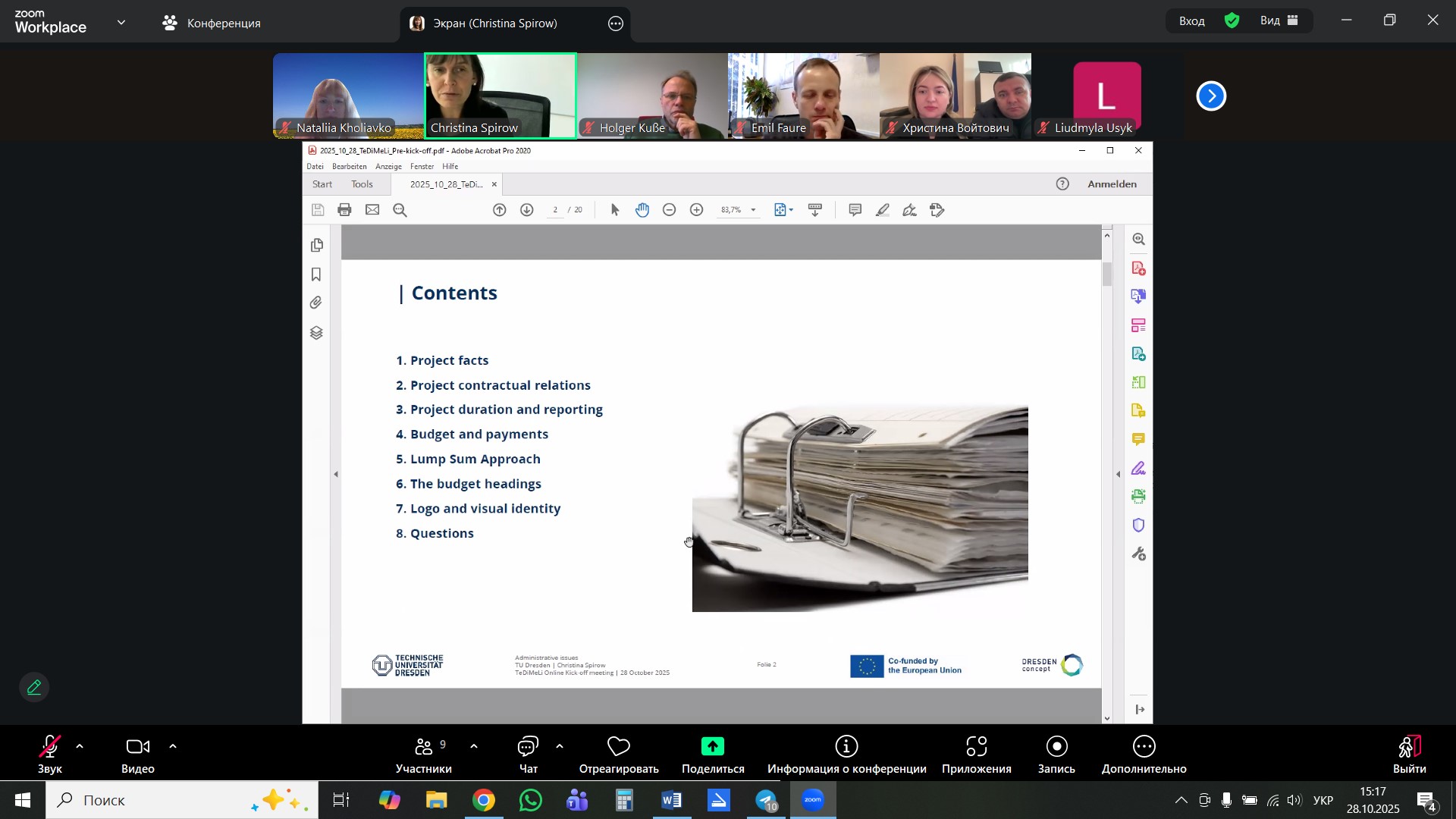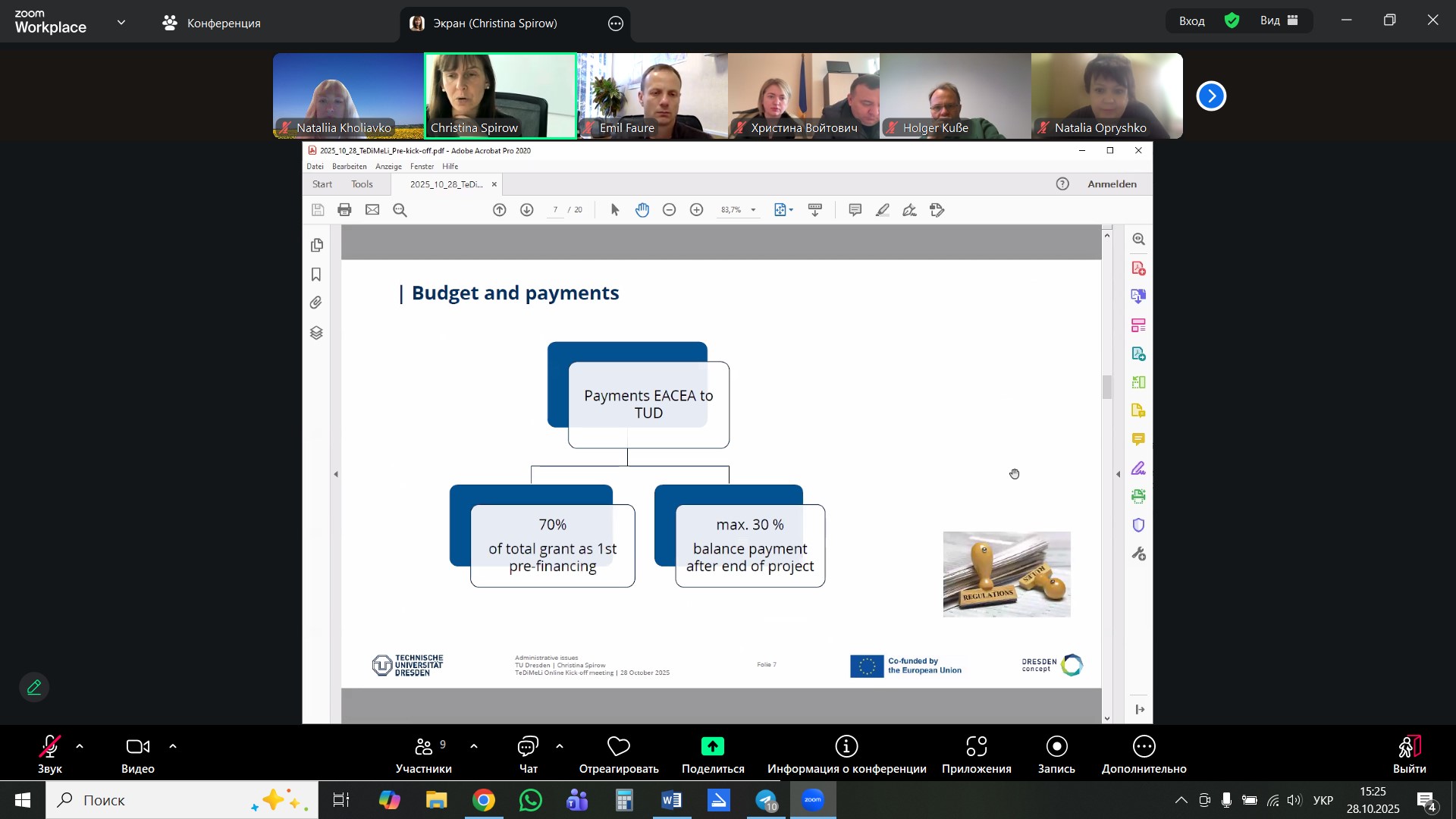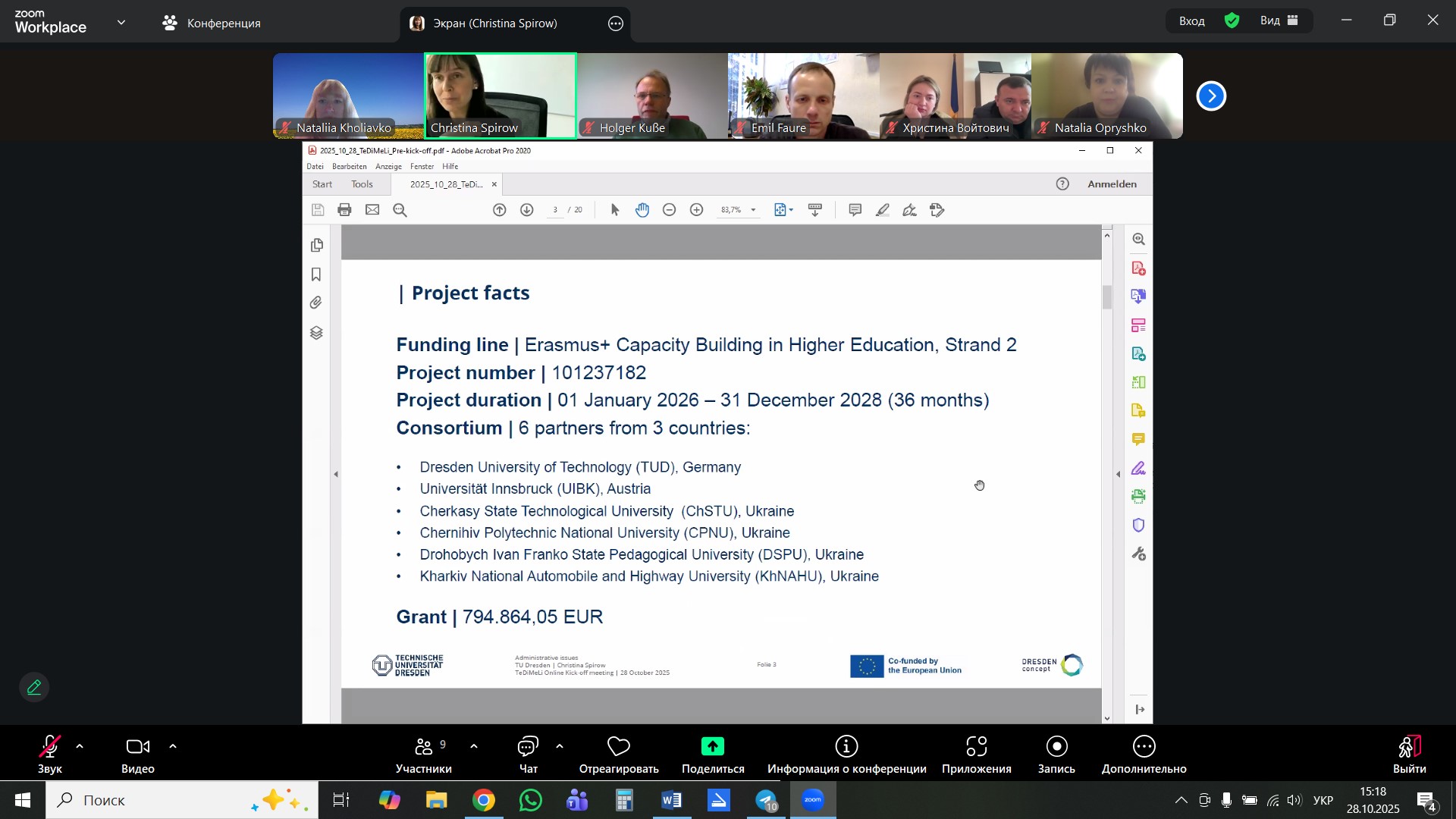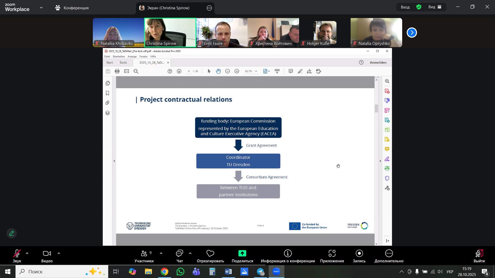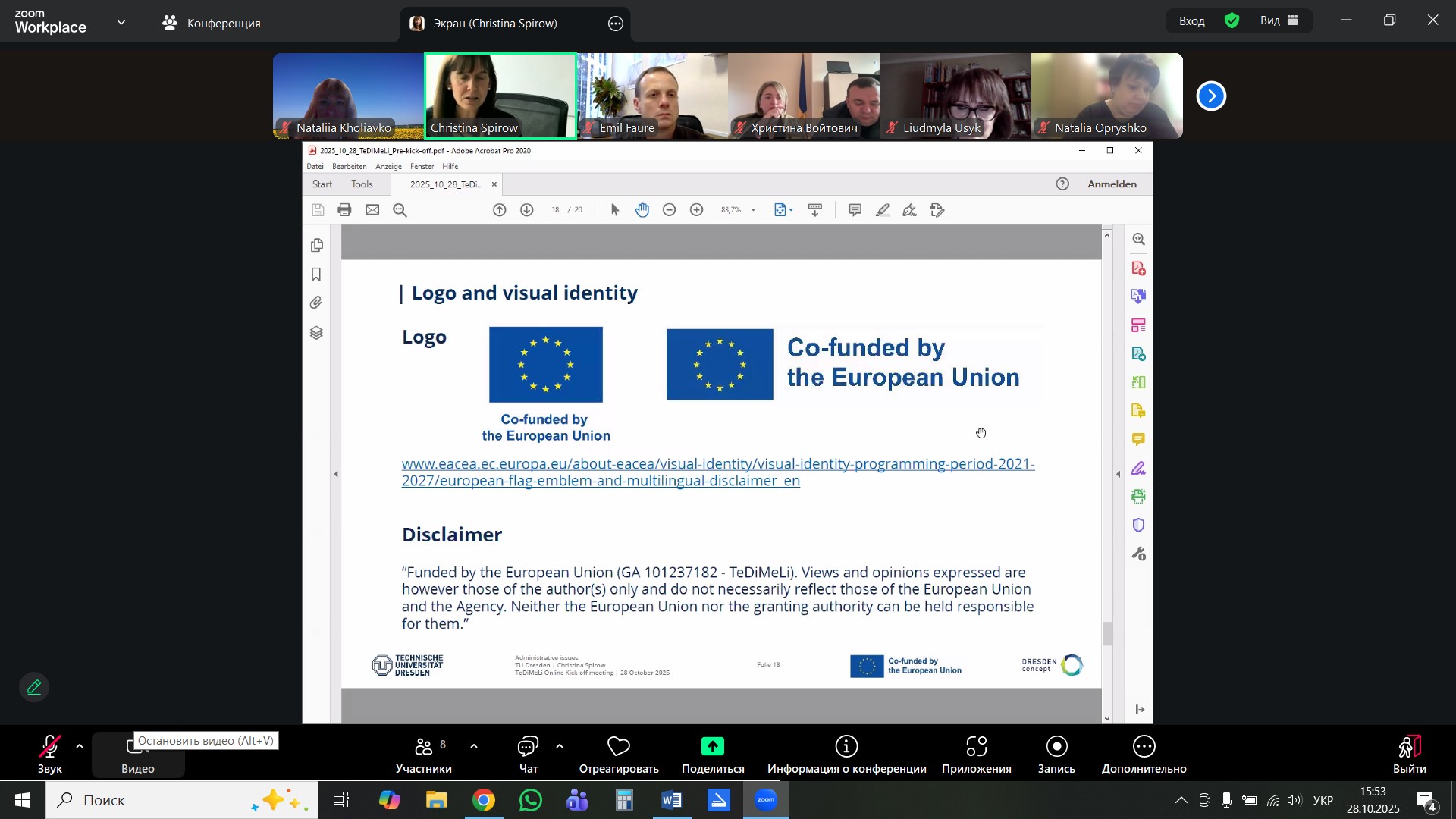 Під час установчої зустрічі зустрічі пані Христина Спіроу (Christina Spirow, Технічний університет м. Дрездена, Німеччина) представила ключові факти щодо проєкту TeDiMeLi: його мету, структуру, очікувані результати та цільову аудиторію. Окрему увагу приділили договірним відносинам між партнерами. Учасникам з’ясували основні положення партнерської угоди, права та обов’язки кожної сторони, а також механізми співпраці в адміністративній і фінансовій сферах. Було підкреслено, що взаємодія відбуватиметься на принципах прозорості, відповідальності та взаємної підтримки. Партнери узгодили ключові етапи реалізації проєкту та графік підготовки звітної документації, зокрема проміжної та фінальної звітності, а також вимог до їх оформлення відповідно до стандартів Європейського Союзу.