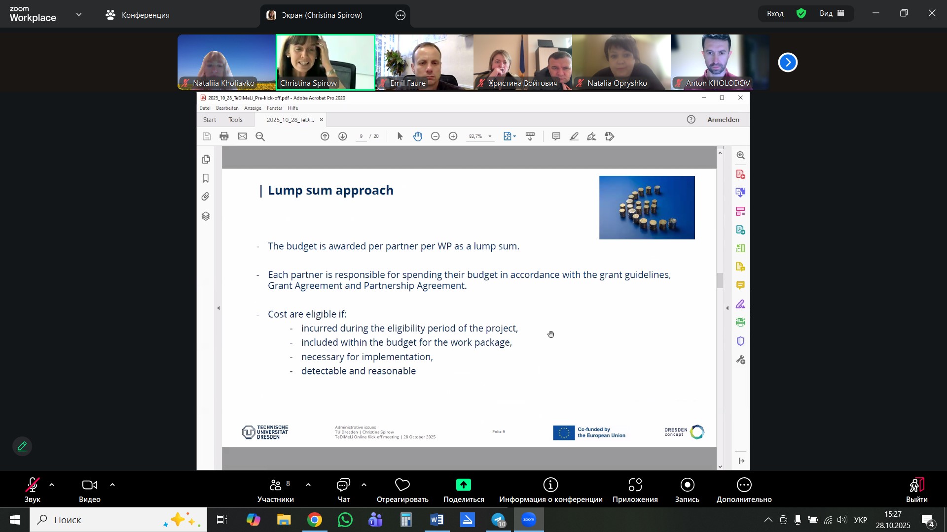 Важливою темою стала організація бюджету та здійснення платежів. Учасники зустрічі отримали роз’яснення щодо правил використання коштів, їх цільового призначення, процедури фінансового контролю та підтвердження витрат. Акцент зробили на необхідності ведення чіткої документації та забезпечення відповідності усіх фінансових операцій положенням грантової угоди. Окремо було проаналізовано підхід Lump Sum, який передбачає фінансування на основі фіксованих сум за результатами виконання конкретних етапів роботи. Такий підхід дозволяє підвищити ефективність адміністрування проєкту та зменшити бюрократичне навантаження на партнерів.