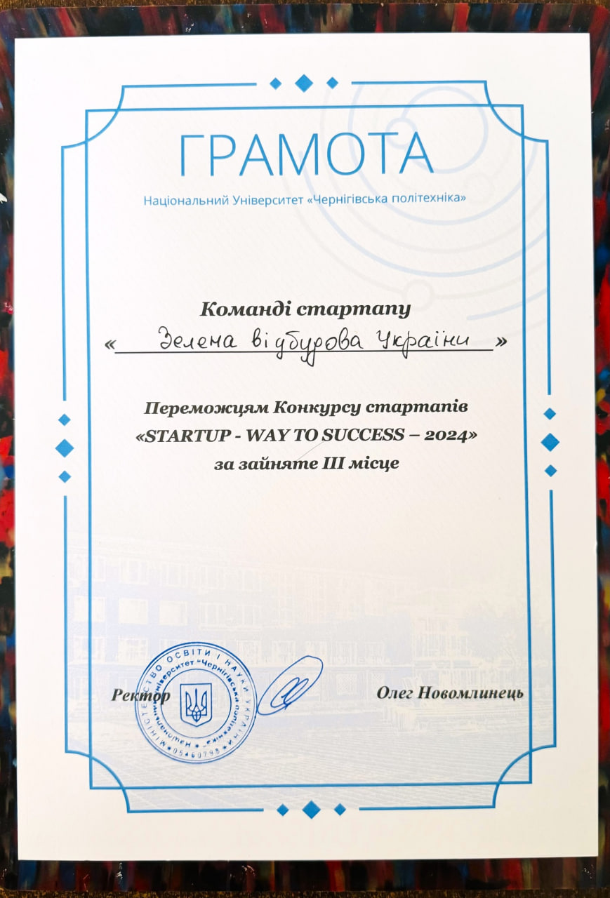 🥉Зелена відбудова України — третє місце та 10 тисяч гривень. Кошти підуть на проведення курсу з 3D-моделювання, закупівлю канцелярського приладдя та озеленення однієї з відновлених аудиторій Чернігівської політехніки. Проєкт спрямований на відбудову країни з акцентом на екологічні рішення та інноваційні технології. (В складі команди здобувачки вищої освіти Анастасія Сорока, спеціальність 051 «Економіка», гр. МЕД-241; Вікторія Бибик, спеціальність «Економіка», гр. ЕК-221; Аліна Білоус, спеціальність 071 «Облік і оподаткування», гр. ОА-221. Влітку дівчата успішно пройшли навчання у літній школі проекту UniCitues – Shaping urban environments for tomorrow.)