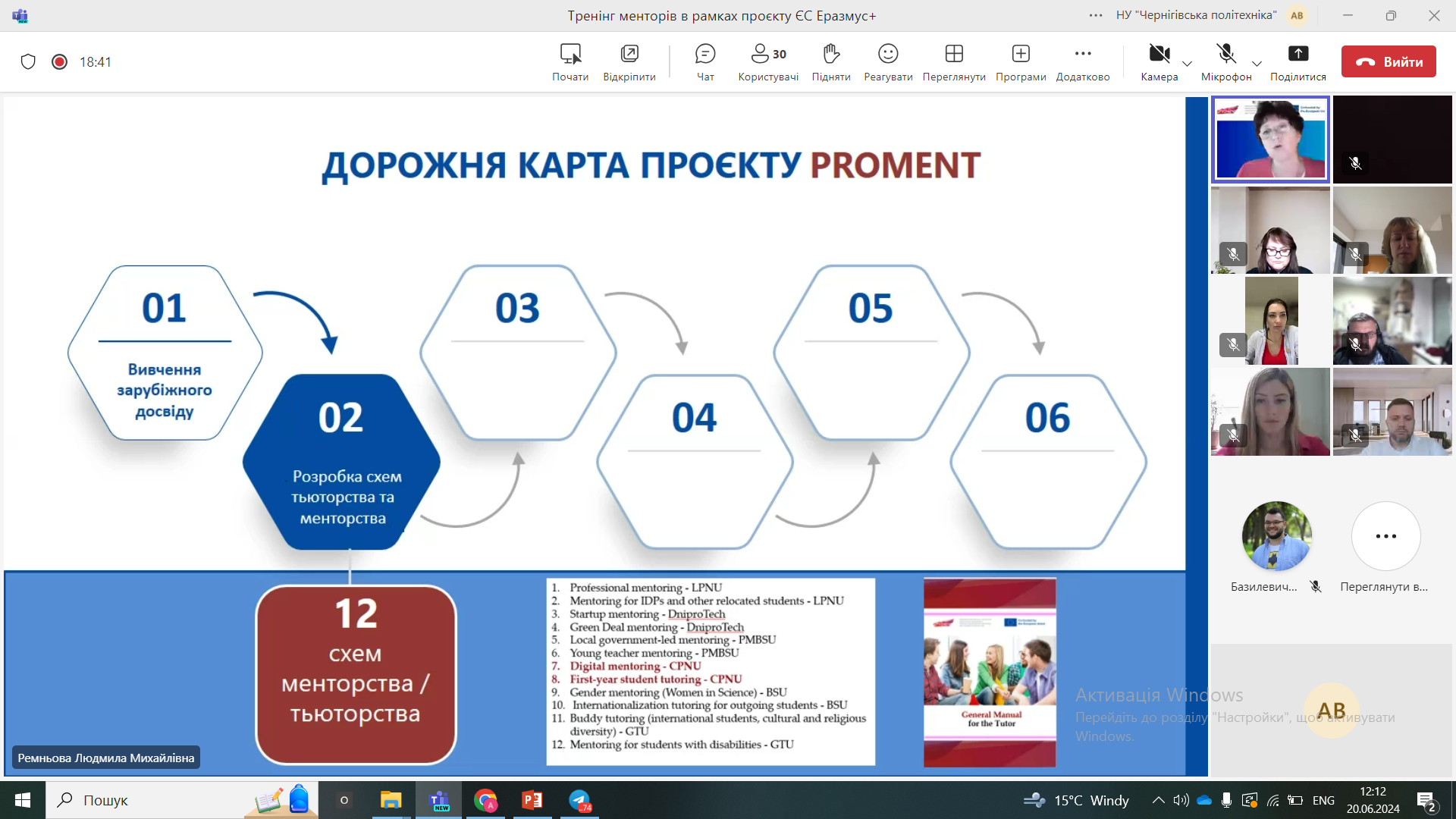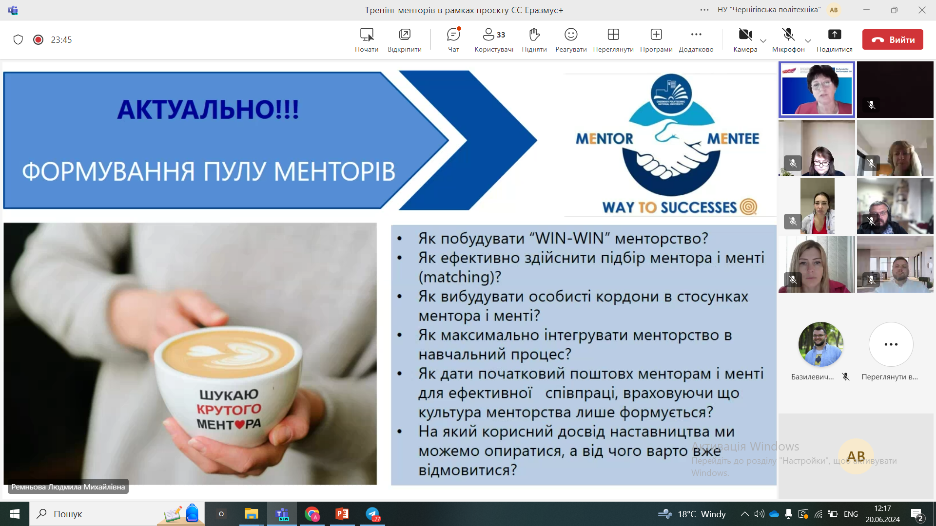 Під час тренінгу Людмила Ремньова, інституційна координаторка проєкту PROMENT детально розповіла про основні задачі міжнародного проєкту та його вплив на розвиток системи менторства в університеті. Вона виділила ряд проблемних питань, які необхідно вирішити для активного впровадження менторства в практику освітньої діяльності в університеті: як побудувати “WIN-WIN” менторство; як ефективно здійснити підбір ментора і менті (matching); як вибудувати особисті кордони в стосунках ментора і менті; як максимально інтегрувати менторство в навчальний процес; як дати початковий поштовх менторам і менті для ефективної співпраці, враховуючи що культура менторства лише тільки формується; на який корисний досвід наставництва ми можемо опиратися, а від чого варто вже відмовитися.