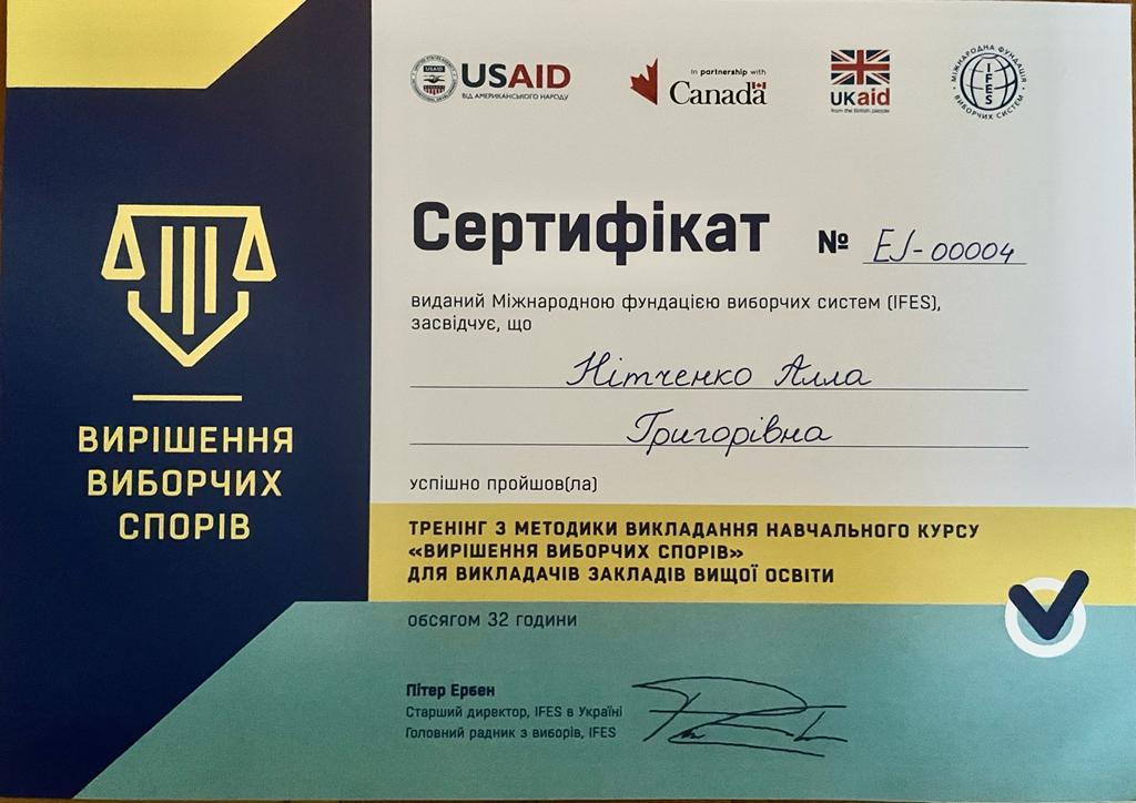 Викладати курс будуть сертифіковані тренерки, доцентки кафедри правоохоронної діяльності та загальноправових дисциплін ОЛЕНА КОЗИНЕЦЬ та АЛЛА НІТЧЕНКО, які пройшли тренінг для викладачів ЗВО з методики викладання навчального курсу «ВИРІШЕННЯ ВИБОРЧИХ СПОРІВ» з 11 по 14 липня 2023 р. в м. Івано-Франківськ.
