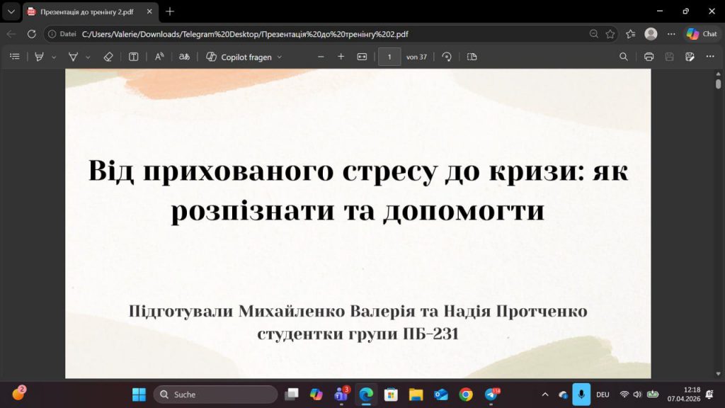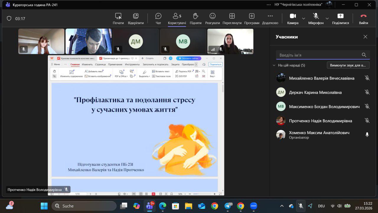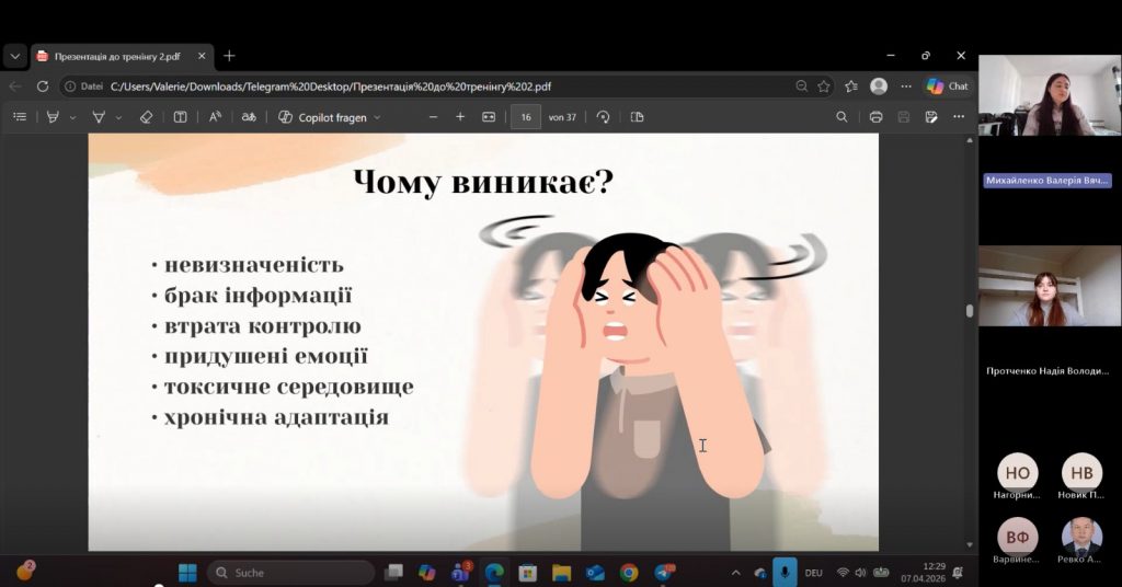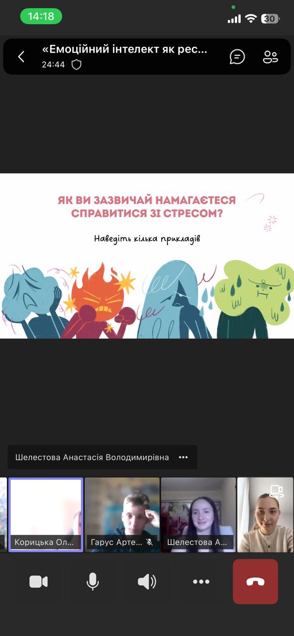 На заняттях учасники мали можливість актуалізувати знання про стрес, виявити причини стресу сучасної молоді, опанувати навички самодопомоги в подоланні та попередженні стресу.
