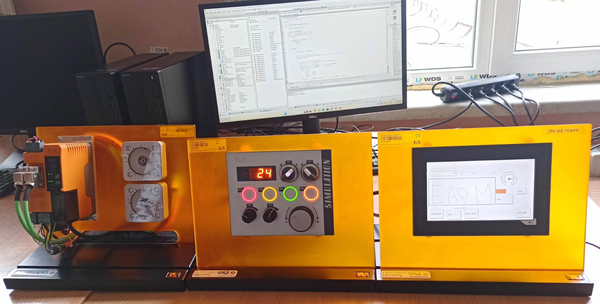 Було проведено діагностику, виконано оновлення програмного забезпечення, налаштовано взаємодію отриманих нових комп’ютерів зі стендами та створено проєкт з візуальним інтерфейсом для демонстрації можливостей стендів. Завдяки цьому, обладнання готове до використання в навчальному процесі в новому навчальному році, зокрема і в курсі “Промислові контролери”.