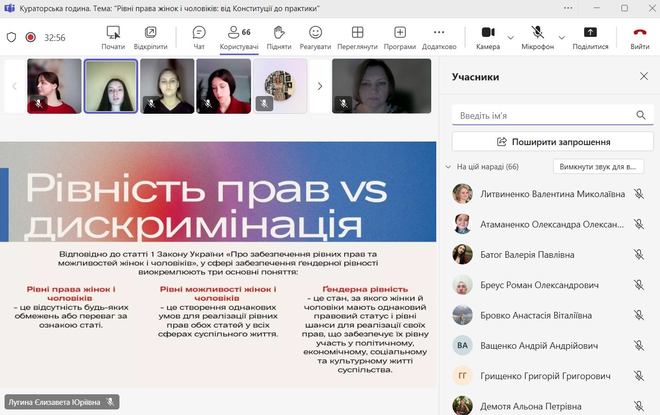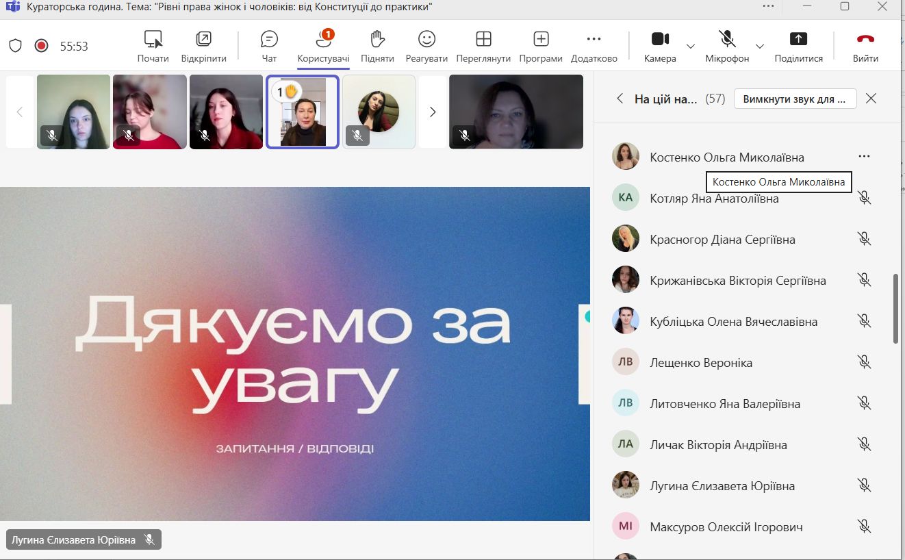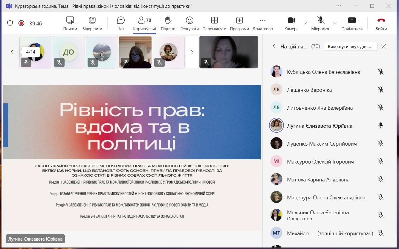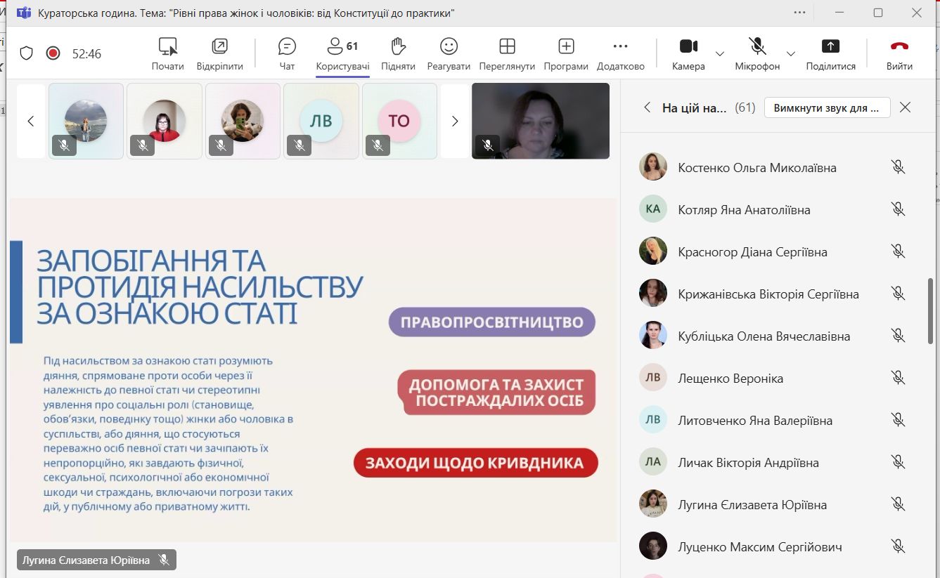 31 жовтня 2025 року відбулася кураторська година на тему «Рівні права жінок і чоловіків: від Конституції до практики», організована студентами-членами юридичної клініки «Adiutorium».