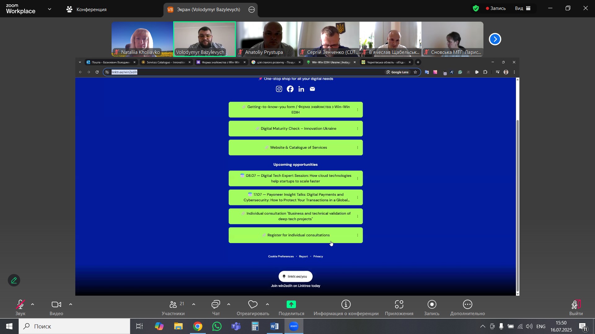 16 липня 2025 року в онлайн-форматі команда Національного університету «Чернігівська політехніка» провела інформаційний захід, присвячений презентації можливостей інноваційного цифрового хабу WIN2EDIH для представників територіальних громад Чернігівської області. Особливу увагу під час заходу було приділено налагодженню співпраці із фахівцям, відповідальним за цифрову трансформацію у своїх громадах.