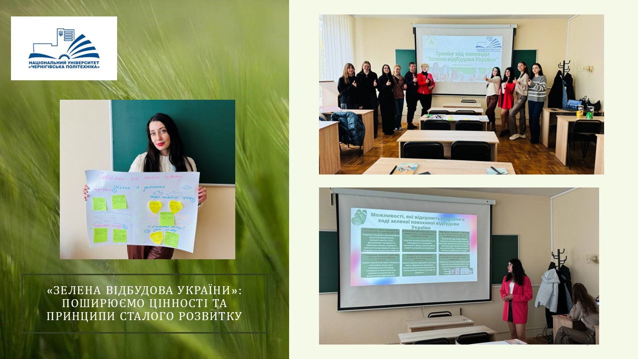 16 жовтня 2024 року командою стартапу «Зелена відбудова України» (Анастасія Сорока, спеціальність 051 «Економіка», гр. МЕД-241; Вікторія Бибик, спеціальність «Економіка», гр. ЕК-221; Аліна Білоус, спеціальність 071 «Облік і оподаткування», гр. ОА-221; Сергій Мазур, IT-консультант команди, випускник НУ «Чернігівська політехніка»; Катерина Гнедіна, науковий керівник, к.е.н., доцент кафедри економіки, обліку і оподаткування) був організований та проведений тренінг з основ сталого розвитку та перспектив зеленої відбудови України з використанням інноваційних технологій та рішень. До участі в заході у змішаному форматі долучилися здобувачі вищої освіти НУ «Чернігівська політехніка» першого року навчання, які прагнуть здобути знання у сфері сталого розвитку та започаткувати власні ініціативи з досягнення ЦСР в майбутньому.