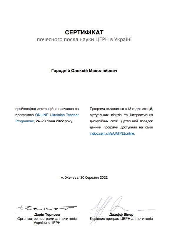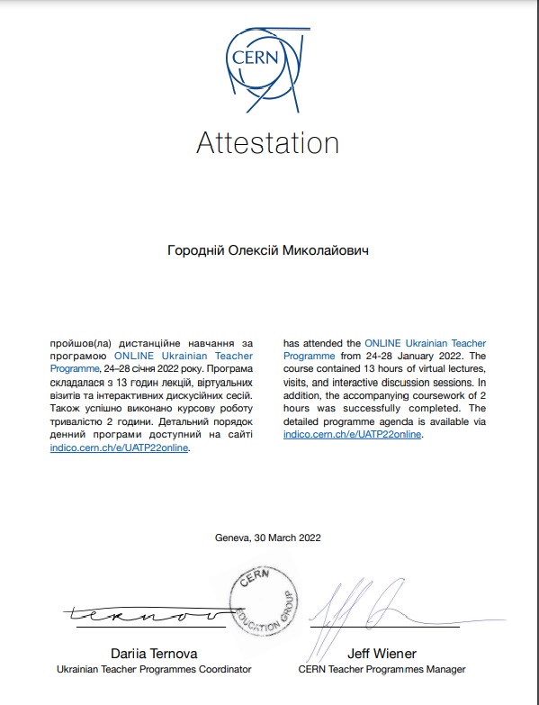 За результатами роботи Першої онлайн наукової школи ЦЕРН UATP-2022 був складений та відправлений до організаційного комітету відповідний звіт, на основі якого зараз отримані відповідні сертифікати.