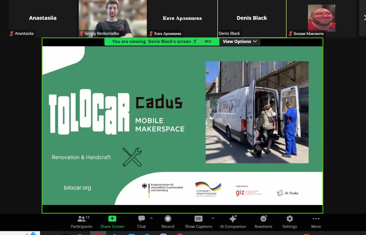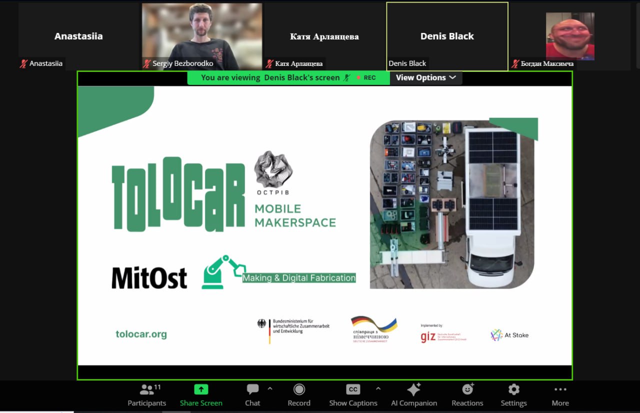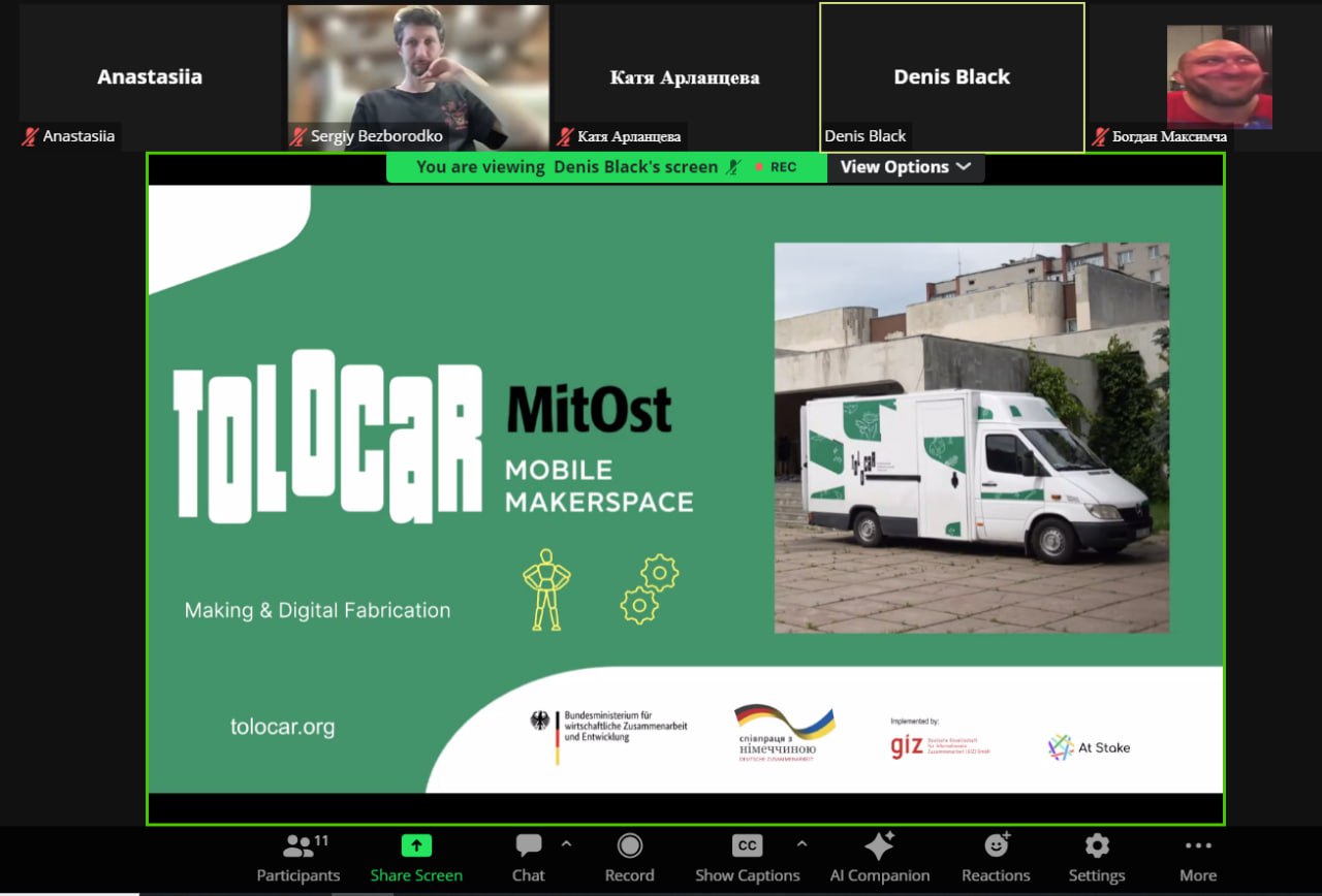 10 квітня 2024 року відбулась онлайн-зустріч, де Денис Квасов, оператор мобільного мейкерплейсу, розповів про роботу мобільного мейкерського простору Tolocar.