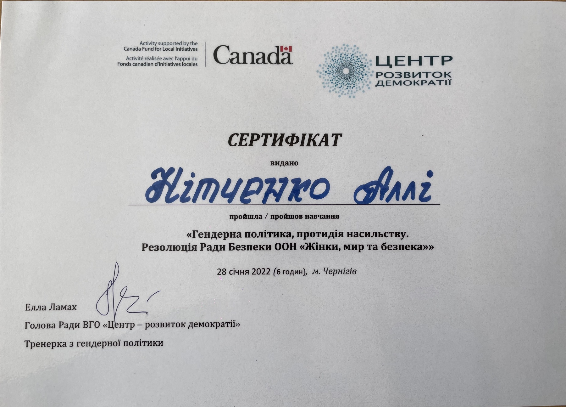 28 січня 2022 р. викладачки Національного університету «Чернігівська політехніка, членкині ГО «Центр ґендерної освіти» – завідувачка кафедри філософії і суспільних наук Наталія Шакун та доцентка кафедри правоохоронної діяльності та загальноправових дисциплін Алла Нітченко –пройшли навчання «Гендерна політика, протидія насильству. Резолюція Ради Безпеки ООН «Жінки, мир та безпека».