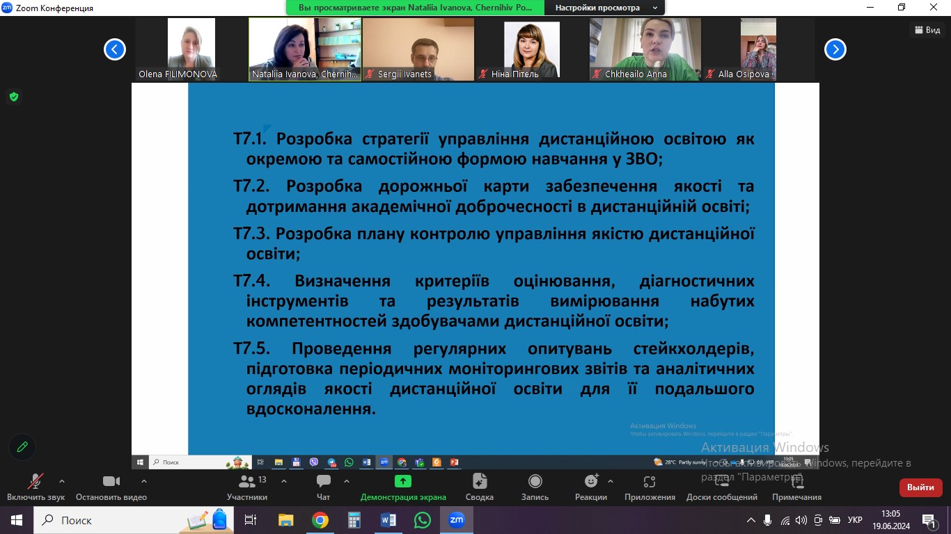 Інституційний координатор проєкту DEFEP від НУ «Чернігівська політехніка», д.е.н., проф. Наталія Іванова як голова Комітету з якості та етики ознайомила учасників засідання із особливостями виконання завдань у межах робочого пакету WP 7 «Моніторинг та забезпечення якості системи дистанційної освіти» (опис, очікувані результати, встановлені терміни та вимоги).