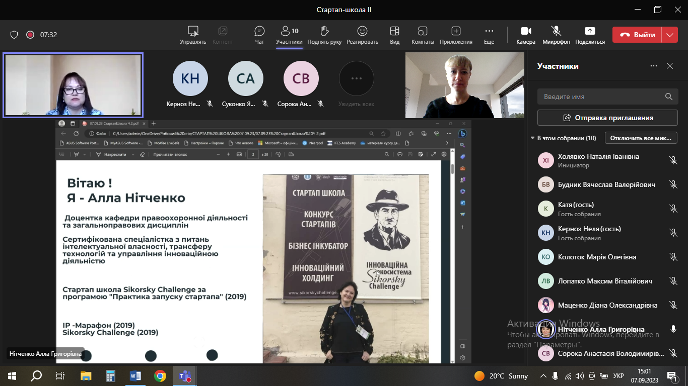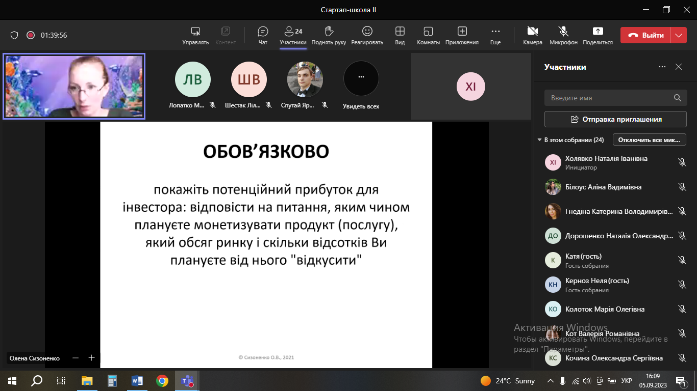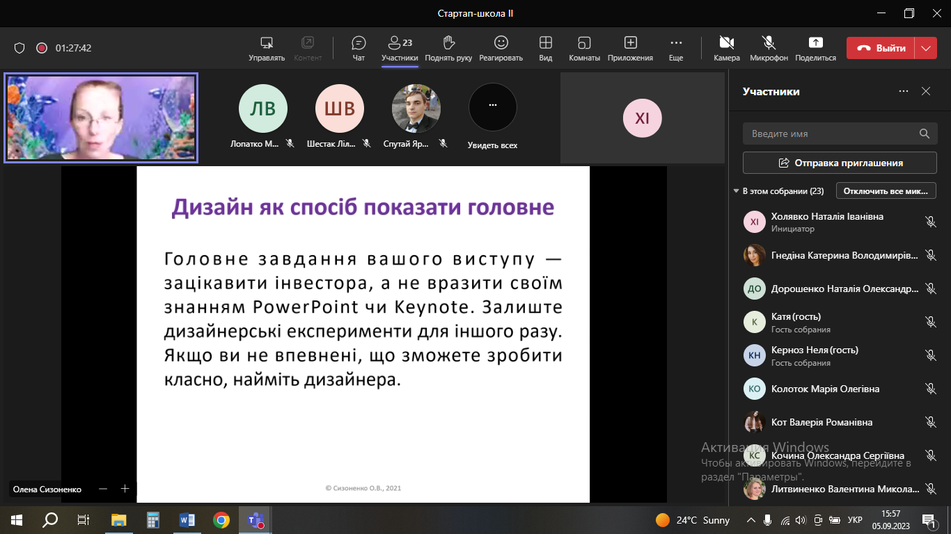 5 і 6 вересня перед учасниками конкурсу з інтерактивною лекцією на тему «Презентація стартапу. Основні принципи презентації. Основи та техніки публічних виступів» виступила Сизоненко Олена Володимирівна.