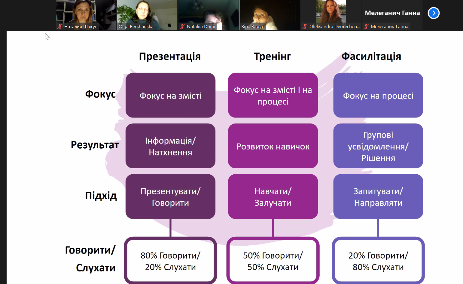 - визначали відмінності презентації, тренінгу та фасилітації;