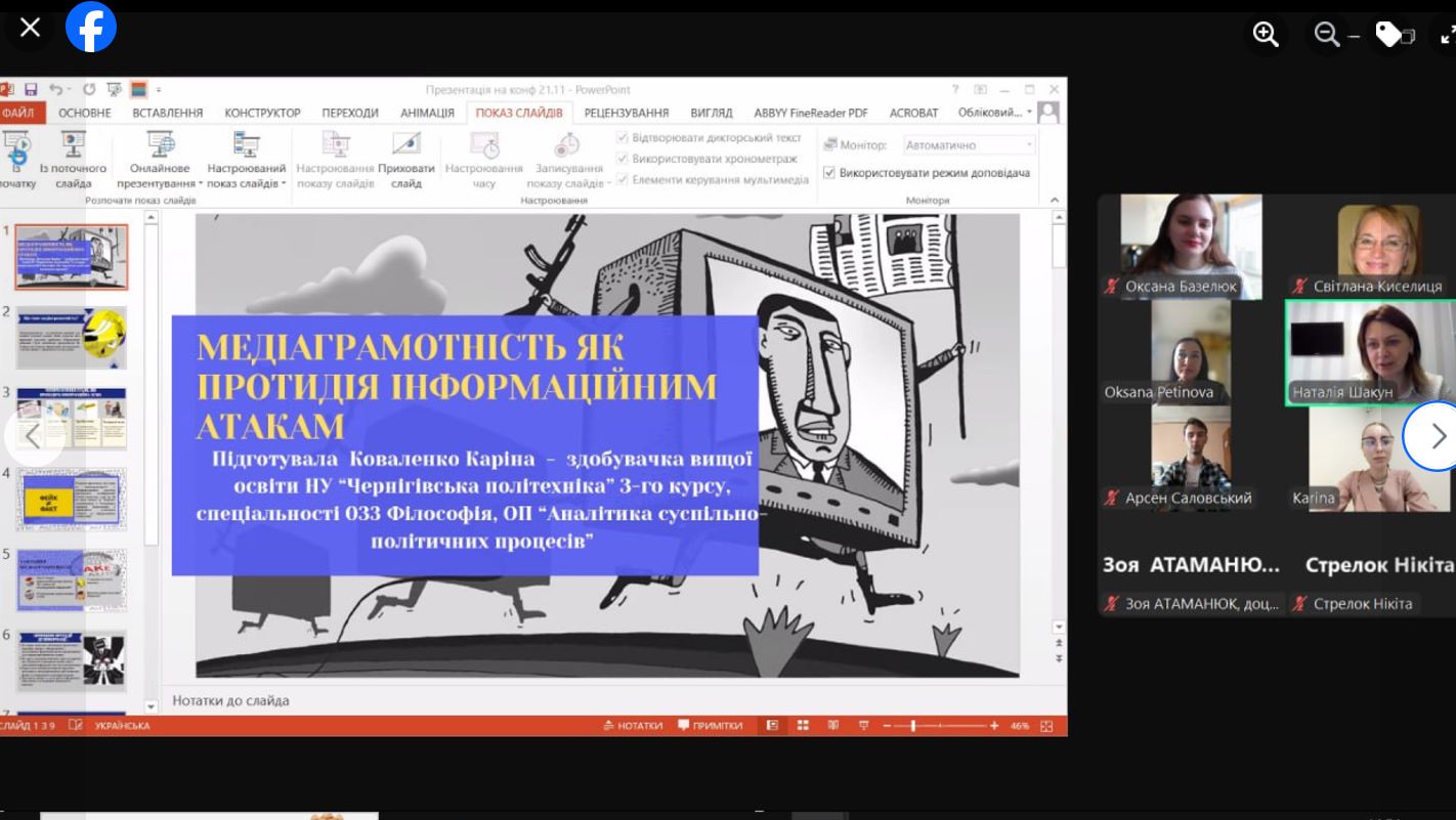 Секційні засідання VII Всеукраїнської науково-практичної конференції студентів та молодих вчених «Південноукраїнські наукові студії» в День філософії об’єднали студентів та аспірантів, науково-педагогічних працівників ЗВО-партнерів (Університет Ушинського, МГУ, НУ «Чернігівська політехніка», НУ «Одеська політехніка») у продуктивній дискусії та творчому діалозі. Висвітлено актуальні теми, представлено результати власних досліджень, обговорено проблематику наукових розвідок аспірантів. НУ «Чернігівська політехніка представляли – Каріна Коваленко (доп. «Медіаграмотність як протидія інформаційним атакам», науковий керівник доц. Олексій Колєватов), Нікіта Стрелок (доп. «Креативне лідерство як рушій суспільних трансформацій», науковий керівник доц. Наталія Шакун), а також аспірантів – Ярослава Устименка та Олександра Стасюка (НУ «Чернігівська політехніка», науковий керівник доц. Наталія Шакун)