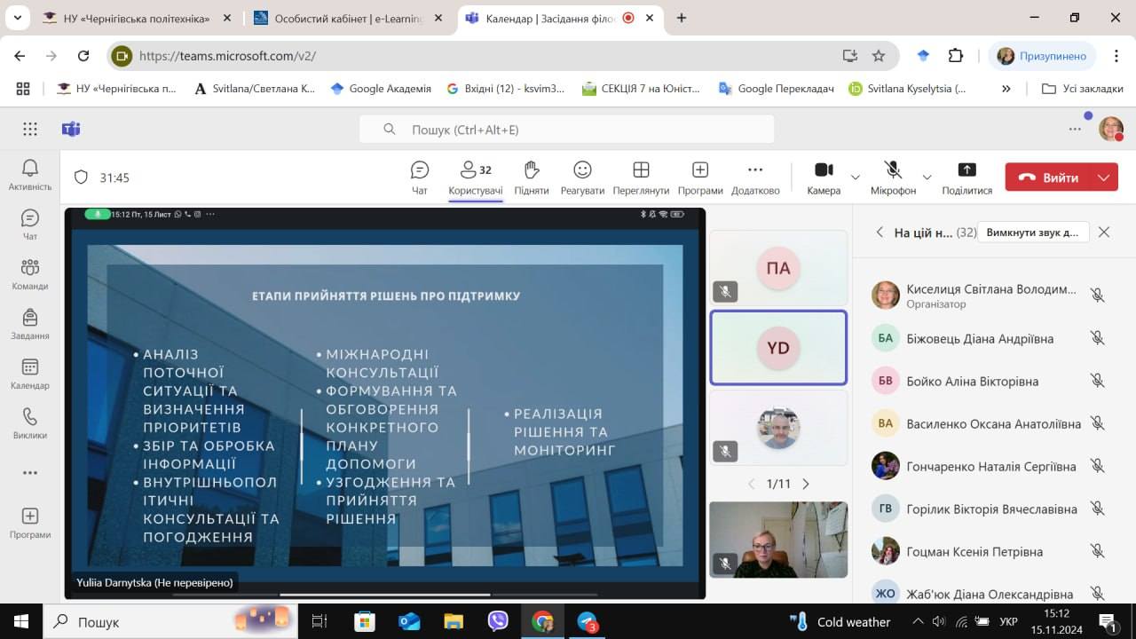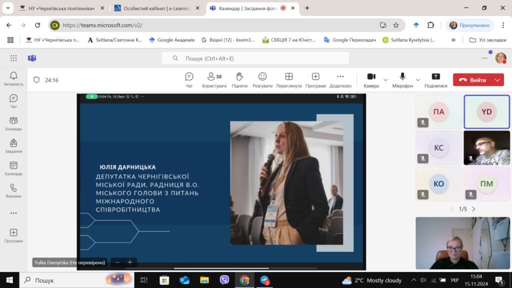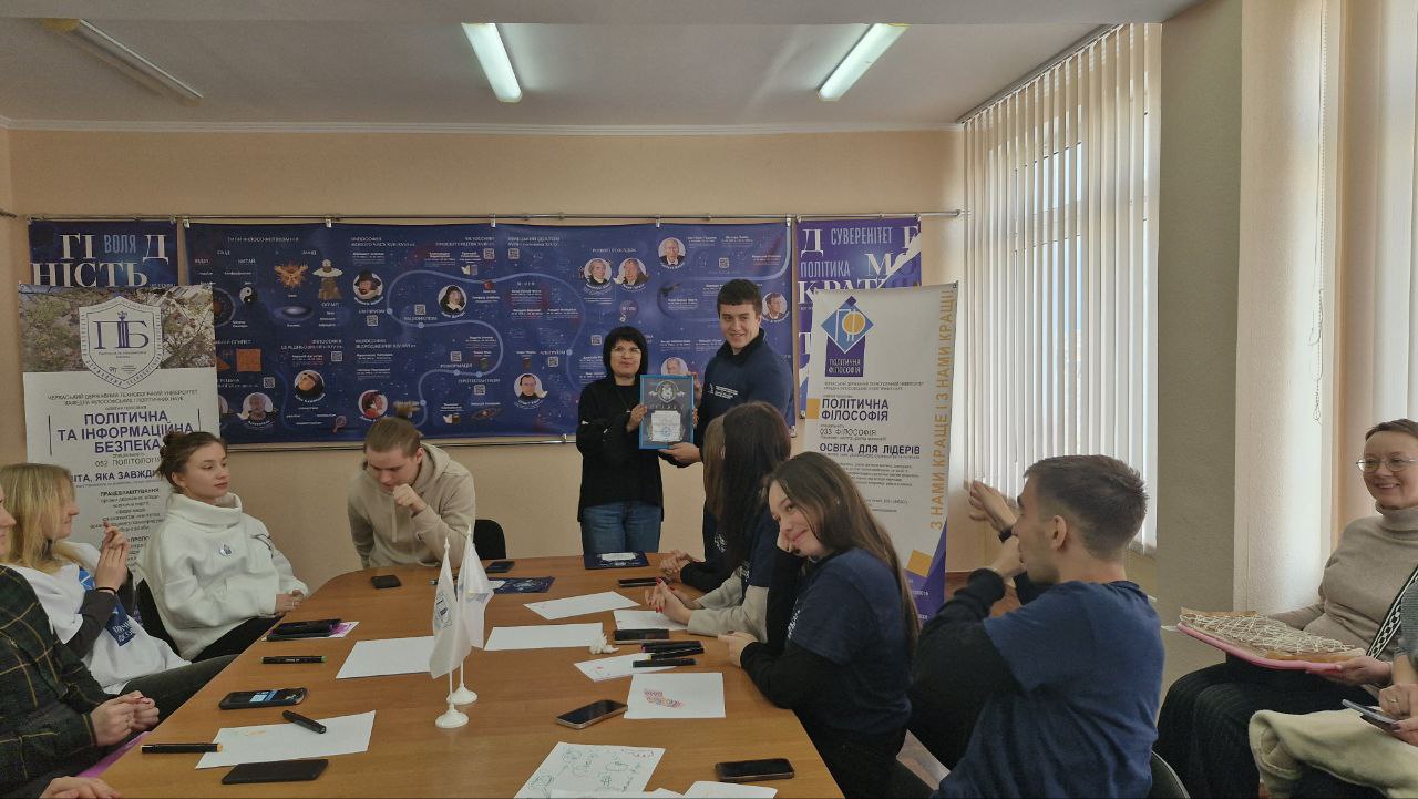 15 листопада відбулося засідання філософської секції наукового гуртка «Аналітичний простір» на яке запросили Юлію Дарницьку, колишню студентку нашого університету, активно діючу депутатку Чернігівської міської ради, радницю в. о. міського голови Чернігова з питань міжнародного співробітництва. Тема аналізу: «Як молодь може впливати на міжнародну політику? Підсилення голосу молодих українців задля підтримки України». Модераторкою обговорення виступила к.філос.н., доц. Світлана Киселиця.
