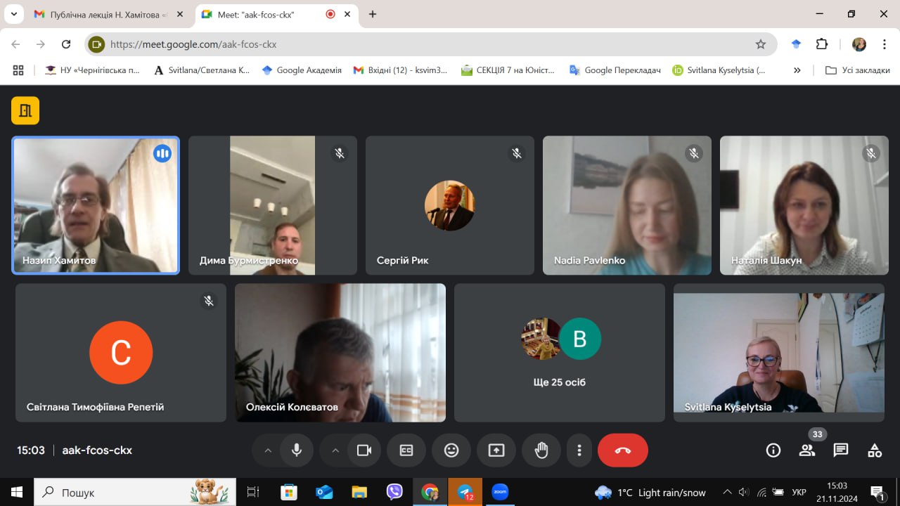 21 листопада 2024 р. відбулась публічна лекція члена-кореспондента НАН України, д.філос.н., проф., провідн.н.с. Інституту філософії ім. Г. С. Сковороди НАН України, Президента Міжнародної асоціації філософського мистецтва, Почесного доктора Національного університету «Чернігівська політехніка» Назіпа Хамітова на тему: «ОНОВЛЕННЯ ФІЛОСОФІЇ ЯК ВІДПОВІДЬ НА ВИКЛИКИ ХХІ ст.: ВІД МЕТАФІЗИКИ ДО МЕТААНТРОПОЛОГІЇ» на якій автор презентував книгу «Філософія науки і культури: словник» та обговорення книги «Війна в Україні і новий гуманізм: Давид проти Голіафа».