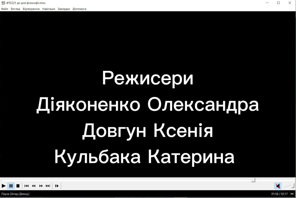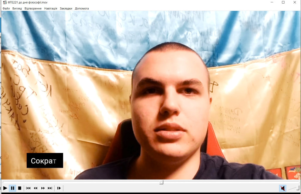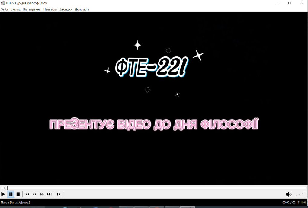 Вітальне відео з нагоди Дня філософії створили й студенти групи ФТЕ- 221 (викладач – доц. Н.В. Шакун). Філософія, як любов до мудрості, досліджує принципи та основні питання людського життя. Вона може надати нам цінні інсайти про те, як жити краще та бути щасливішими», – вважають студенти спеціальностей «Філософія» та «Фізична реабілітація» і наводять цитати видатних філософів, які можуть вплинути на наше життя та змінити його докорінно.