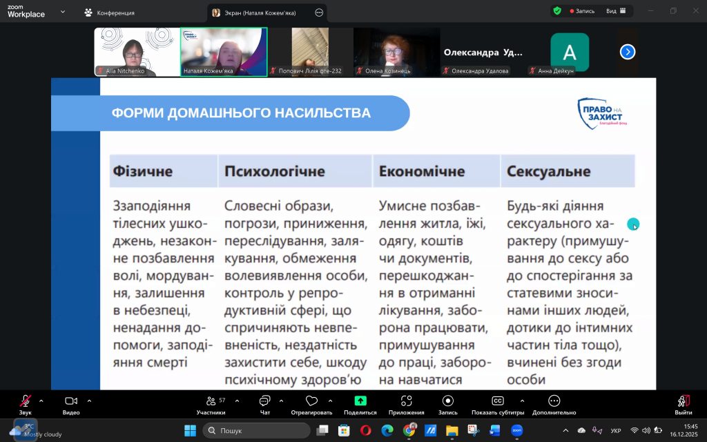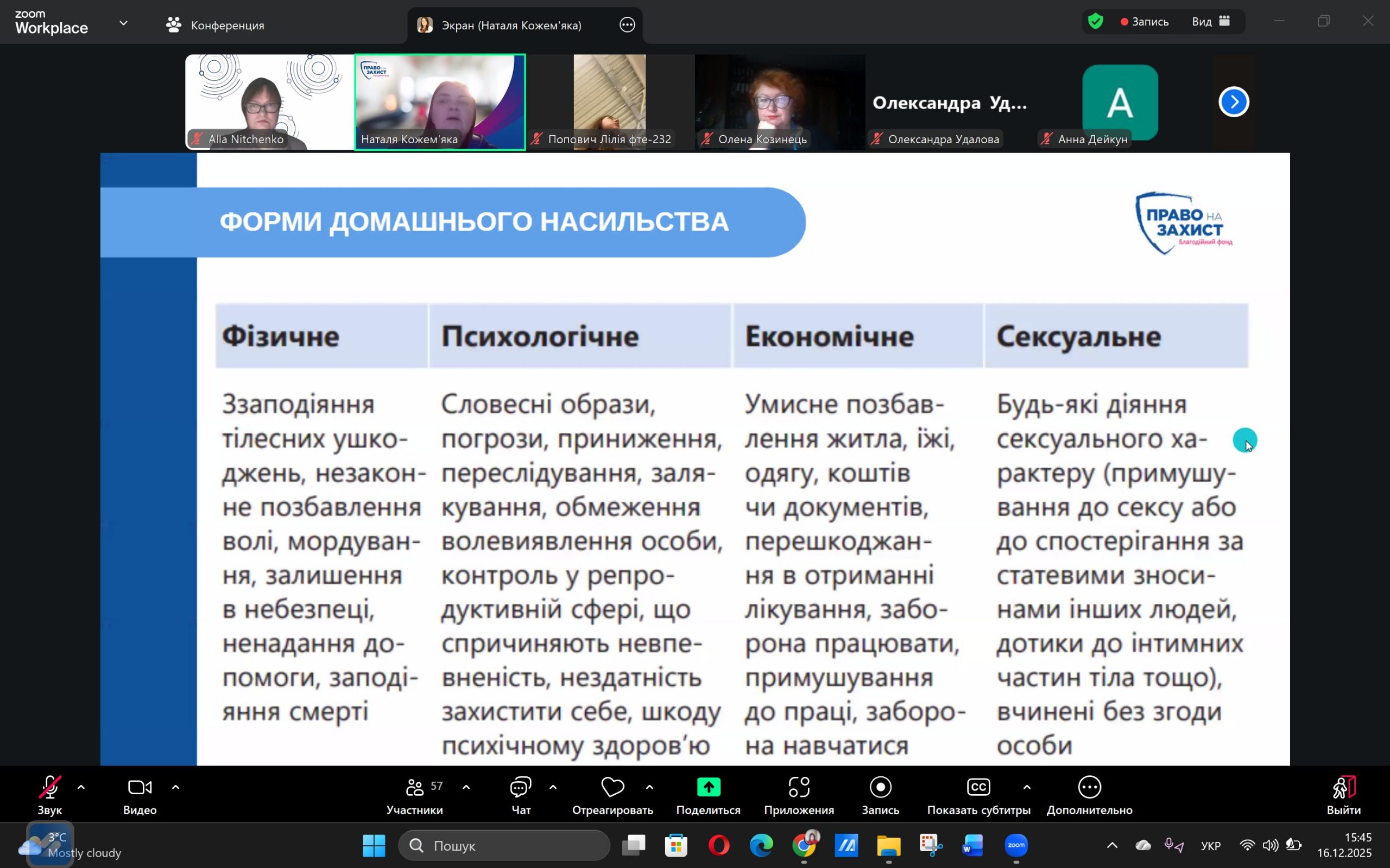 Спікеркою заходу стала Наталія КОЖЕМ’ЯКА – експертка з питань протидії гендерно зумовленому насильству, тренерка БФ «Право на захист». Під час зустрічі учасники обговорили основні прояви гендерно зумовленого насильства, алгоритми реагування, а також доступні механізми підтримки й захисту.